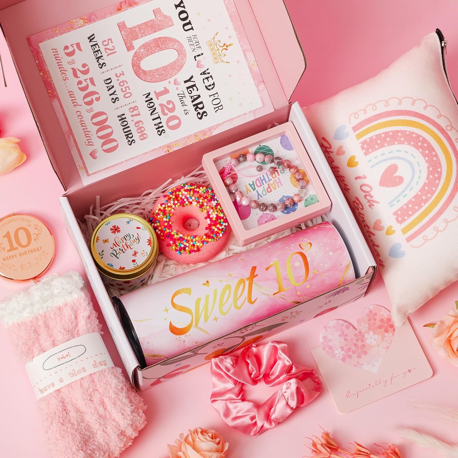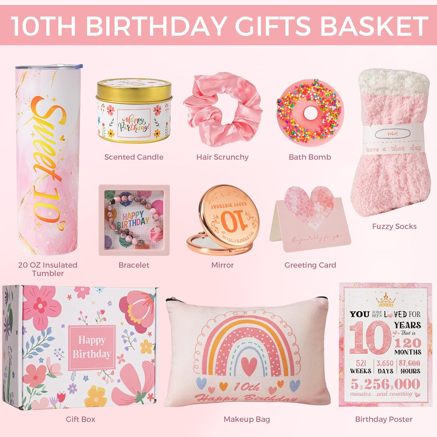Perfect Gifts for 10 Year Old Girl: 11 lovely collection gifts 1 x 20oz tumbler, 1 x scented candle , 1 x makeup bag, 1 x pink fuzzy socks, 1 x hair tie, 1 x birthday card, 1 x natural stone bracelet,1 x mirror,1 x birthday poster ,1 x bath bomb,1 x flower gift box.She’ll unbox pure joy and feel truly cherished, wrapped in a sense of personal serendipity and blessing