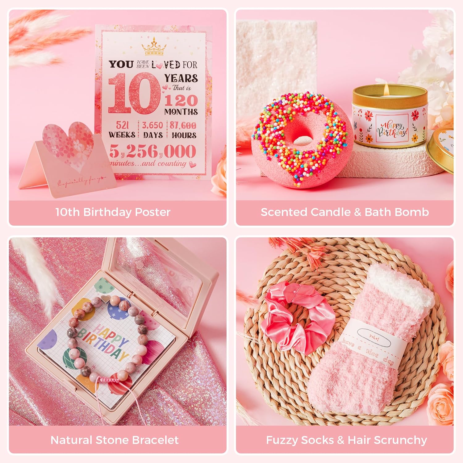 Customized 10th Birthday Gifts For Her: Help her create a soothing relaxing experience at home with relaxing bath bombs and calming scented candles. Complete the self-care setup with a stylish compact makeup mirror and a spacious, practical makeup bag. The set also features a cute pink flower hair clip for a touch of happiness, along with cozy pink socks and an uplifting inspirational bracelet. Every gift comes together with a printable “Happy 10th Birthday” card, making this bundle a heartfelt and unforgettable celebration of love