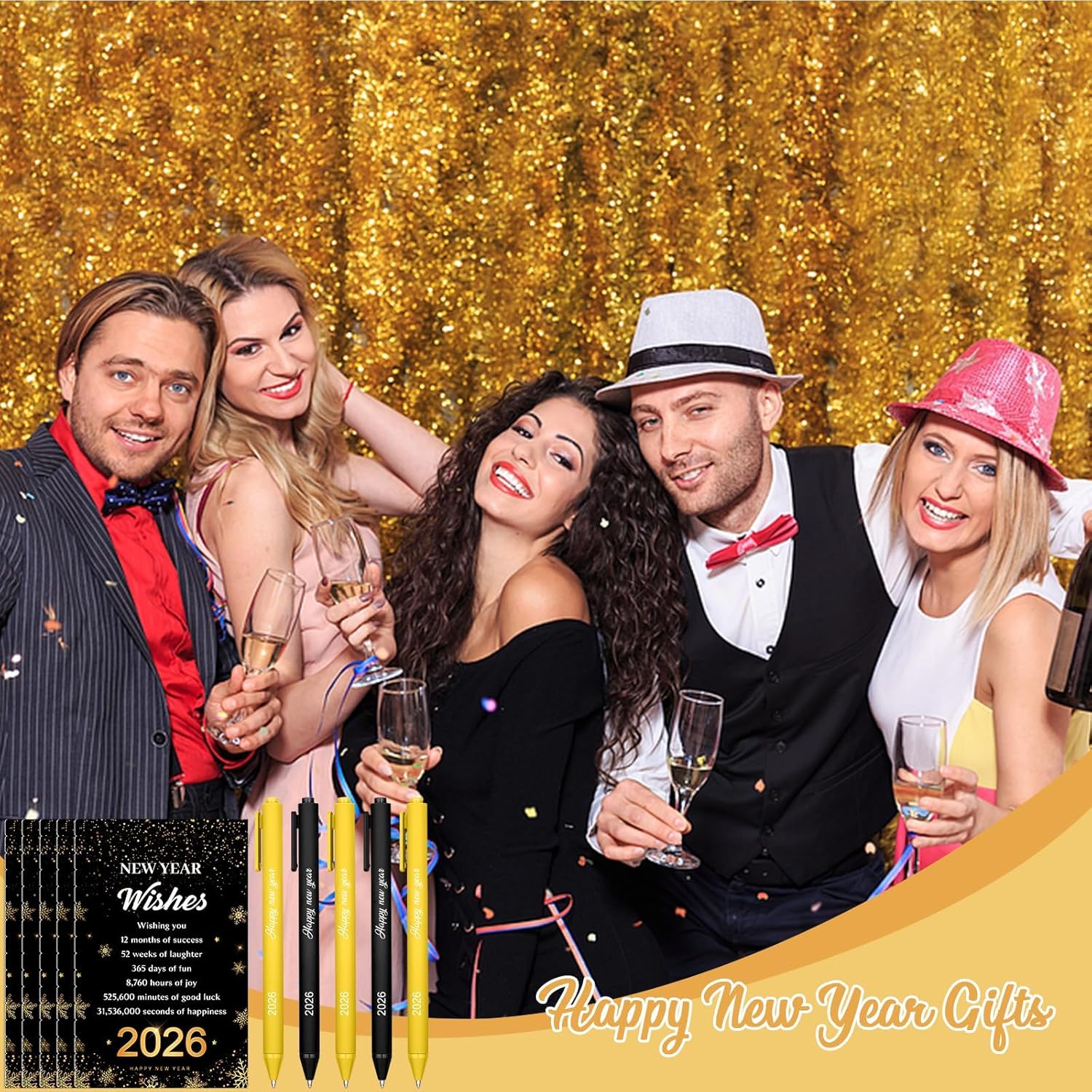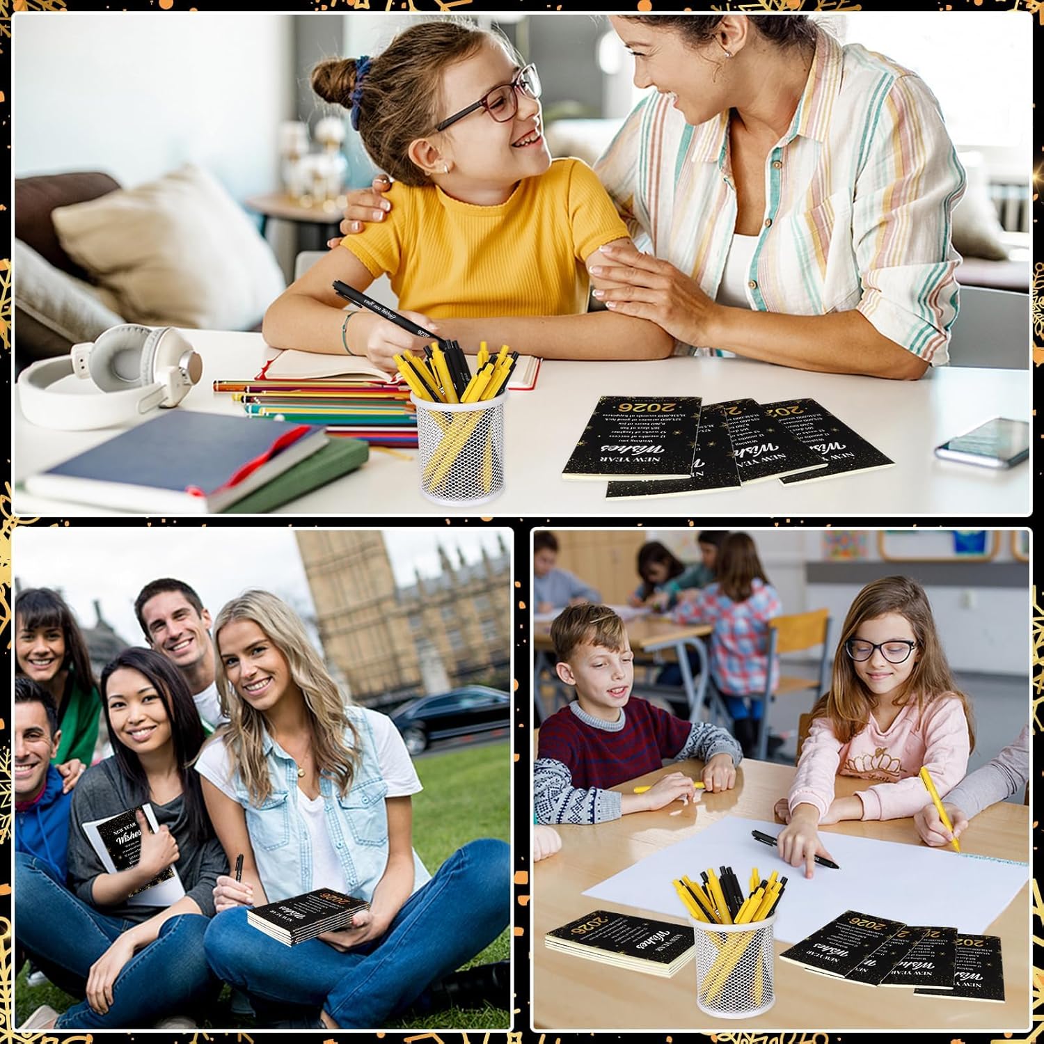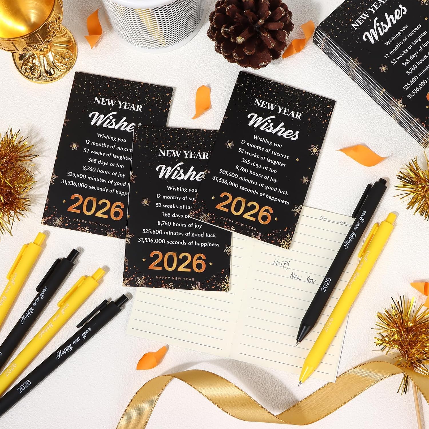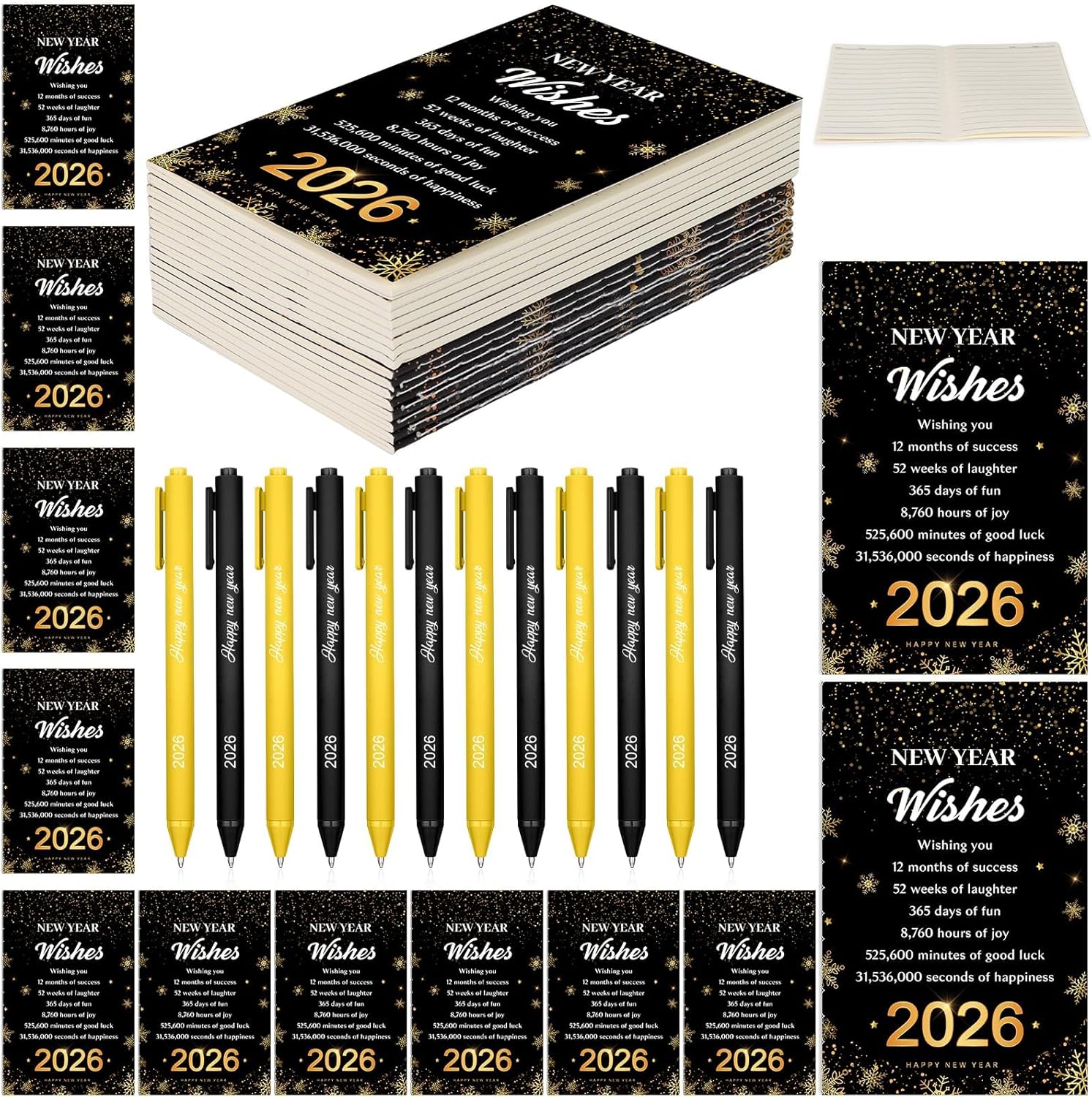 The pens feature bold “2026 Happy New Year” printing, while the notebooks showcase elegant black-and-gold designs, creating a coordinated, joyful aesthetic.