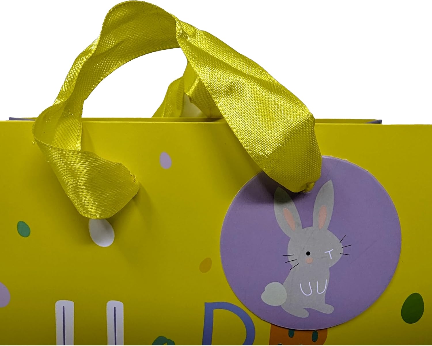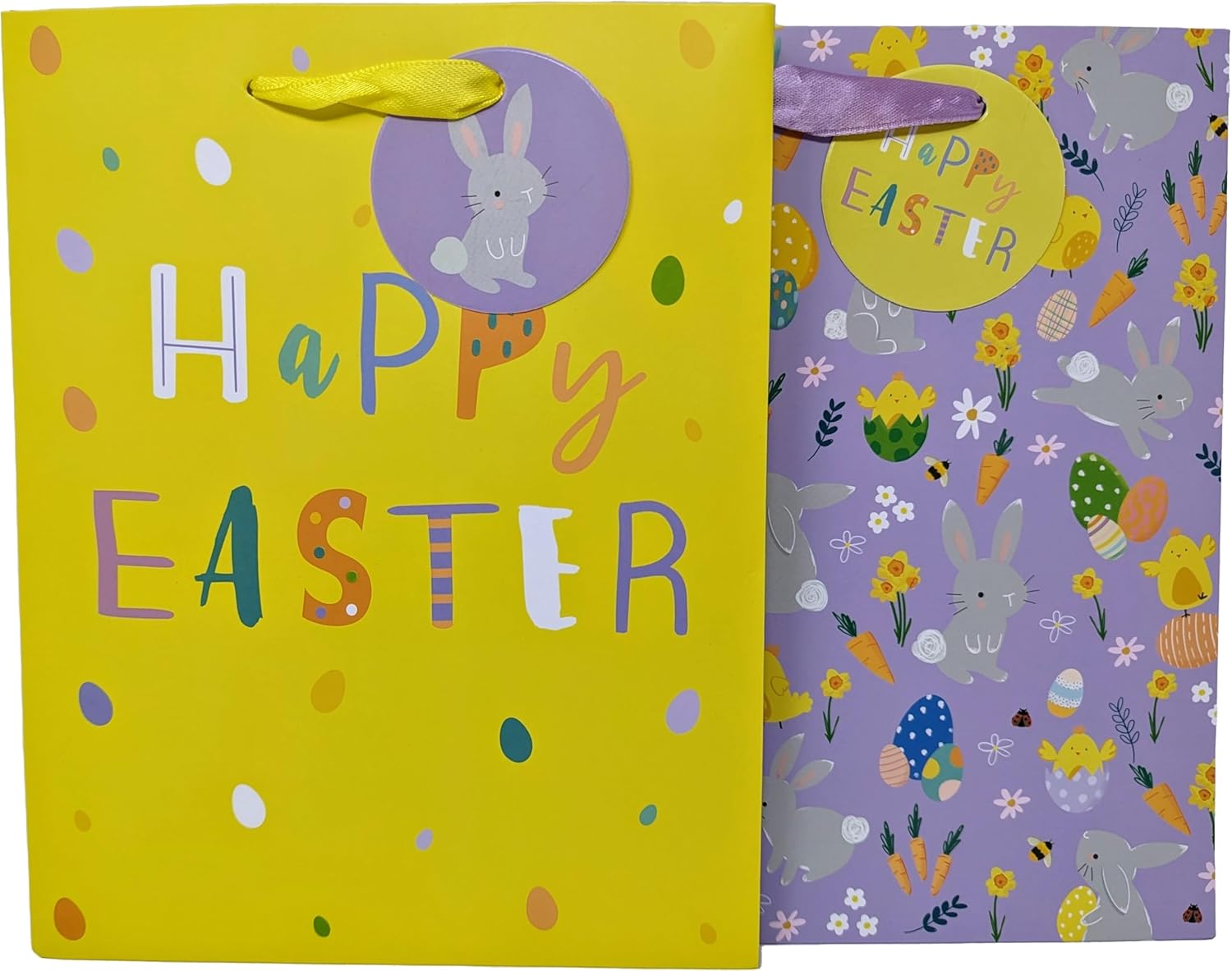 🟡 Design 1 – Cheerful yellow background with vibrant “Happy Easter” text and colourful Easter egg spots. The sides are lilac with a playful carrot pattern, complemented by yellow ribbon handles and a round lilac tag featuring an adorable Easter bunny.