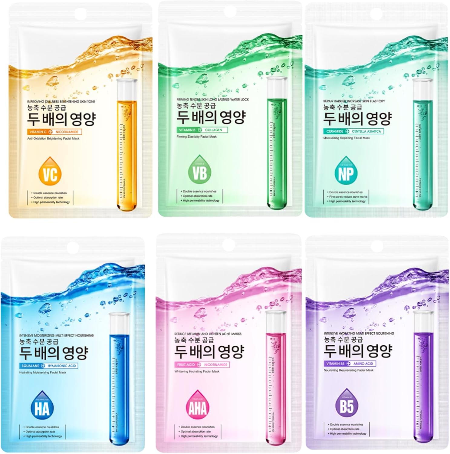 💦【Multi-Functional Skincare Solution】This Korean-inspired face masks Set features 6 unique formulas: Vitamin C + Niacinamide (brightening), Hyaluronic Acid (hydration), Centella Asiatica (soothing), Fruit acid(gentle exfoliation), and Vitamin B5 (repair). Each 25ml sheet mask delivers targeted care for dullness, dryness, acne-prone skin.