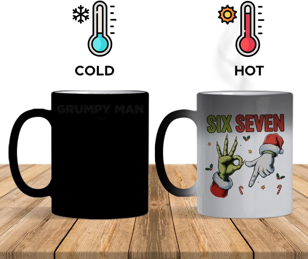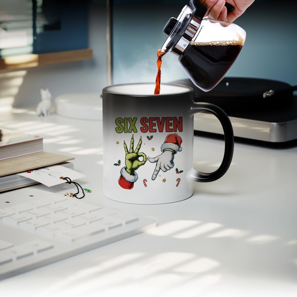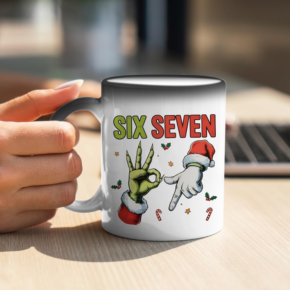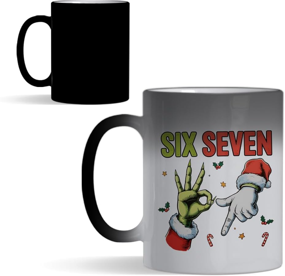 67 Meme, Six Seven Hand Sign Meme, Funny Christmas Humour Gift, 11oz Colour Changing Ceramic Coffee Cup, Magic Mug. (C Shaped Handle)