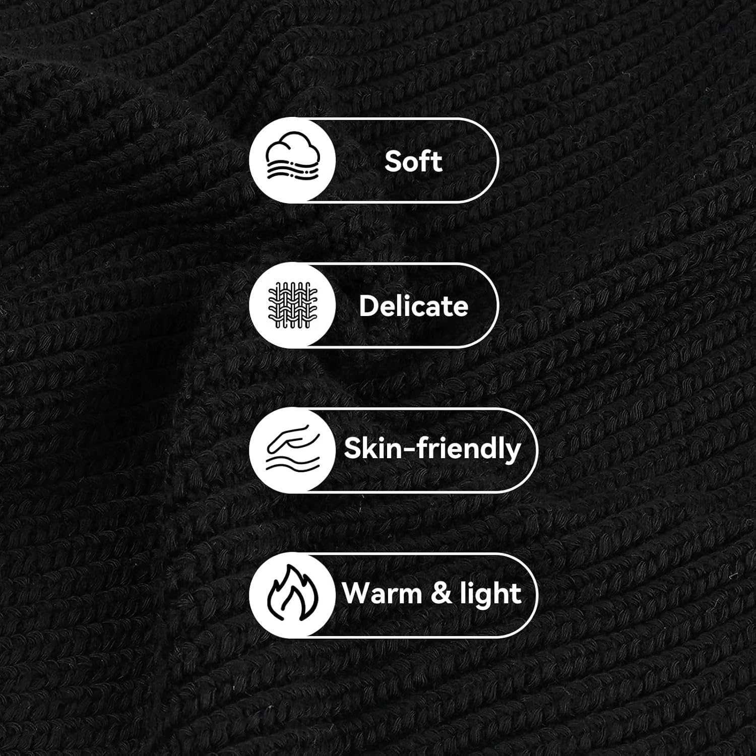 Text reads 'Image 5' and 'Two ways to wear'. Collection of black knit beanies showing various angles and 'Fine knit texture' detail.Text reads 'Image 5' and 'Two ways to wear'. Collection of black knit beanies showing various angles and 'Fine knit texture' detail.