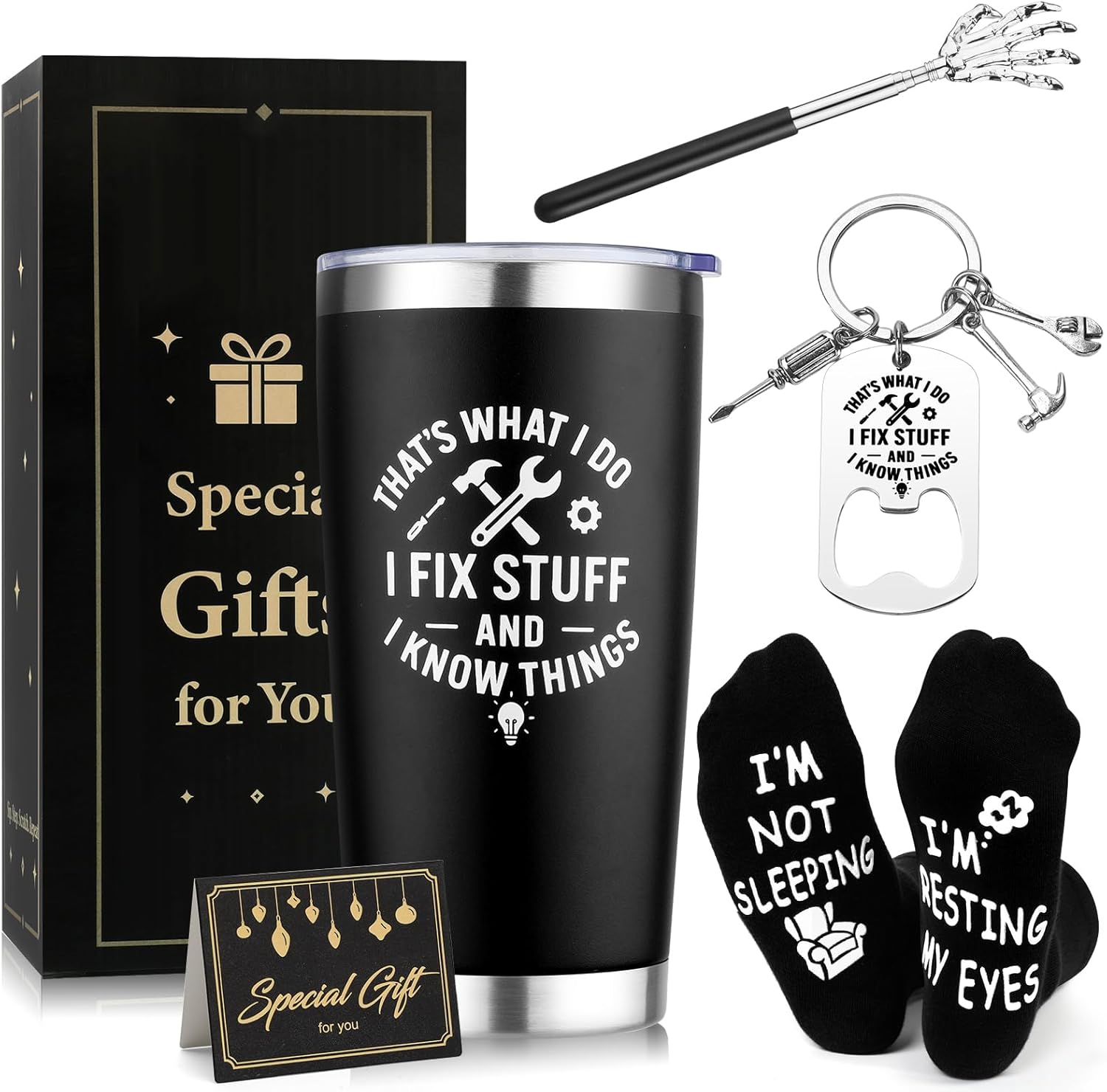 Gift Set for Men: This present package includes a 20oz insulated tumbler, an extendable back scratcher, a pair of men’s socks, a keyring, a greeting card, and a gift box. Ideal for birthdays, anniversaries, Christmas, Father’s Day, Valentine’s Day, or retirement – it’s a fun and practical gift for any occasion.