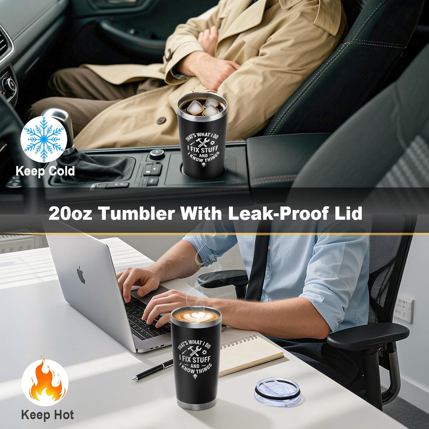 Large Capacity Tumbler: Perfect for life on the go, this 20oz travel tumbler features a spill-resistant lid and double-wall insulation to keep drinks hot or cold for hours. Whether it’s keeping coffee warm during the workday or beer chilled at home, it does a good job. Hand wash is recommended to preserve the non-slip surface.