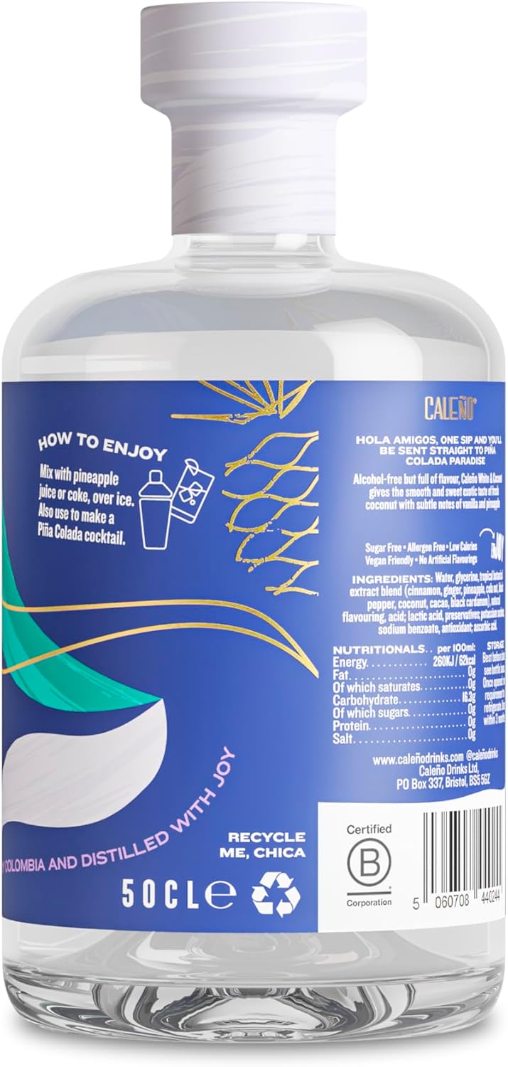 Caleño White Coconut Tropical Alcohol Free Rum 50cl | Created Using Coconut, Vanilla & Pineapple | Non Alcoholic Tropical Gin Alternative | Sugar Free, Gluten Free and Vegan Friendly