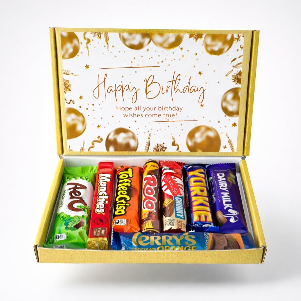Happy Birthday Box Chocolates Has 8 Full Sized Chocolate Bars Which Are Peppermint, Chunky, Terry Orange, Toffee Crisps, Yorkie, Munchies, Dairy Milk And Rolo. All Your Favourite Chocolate Bulk In One Box. depending On Availability, Some Chocolate May Differ.