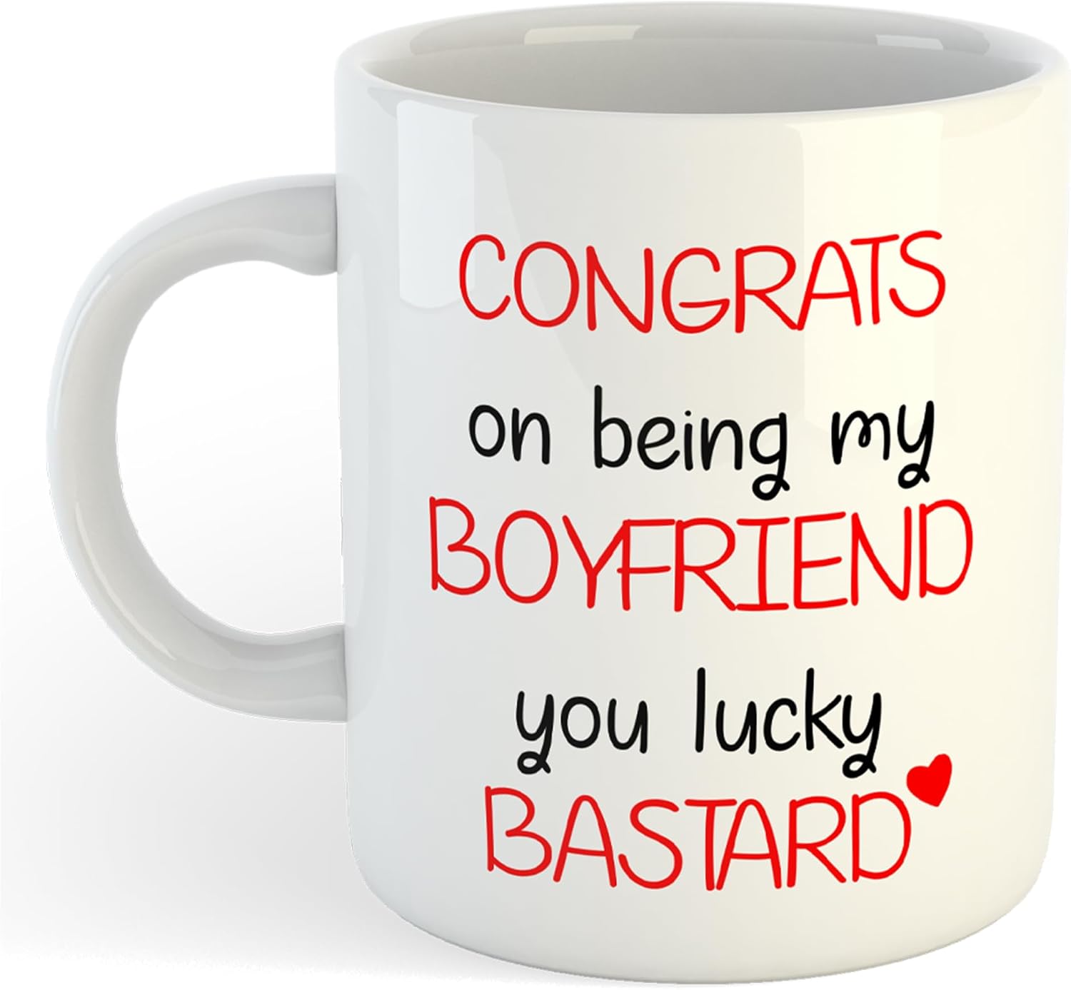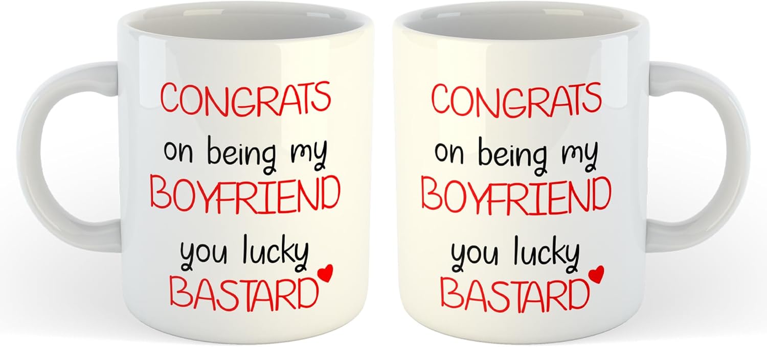 Add a dash of cheeky humour to your morning brew with this playful ceramic mug. Featuring bold red and black text that reads ‘Congrats on being my boyfriend, you lucky bastard’, this 330ml white mug is perfect for those who appreciate witty banter in their relationships. The vibrant, full-colour print makes the message pop, whilst the sturdy ceramic construction ensures your hot beverages stay at the perfect temperature. Each mug arrives in a protective gift box, making it ideal for surprising your significant other with a laugh. Whether it’s for Valentine’s Day, an anniversary, or just because, this mug combines practicality with personality. The generous 11oz capacity is perfect for tea, coffee, or any other favourite beverage. Hand washing is recommended to preserve the vivid print quality.