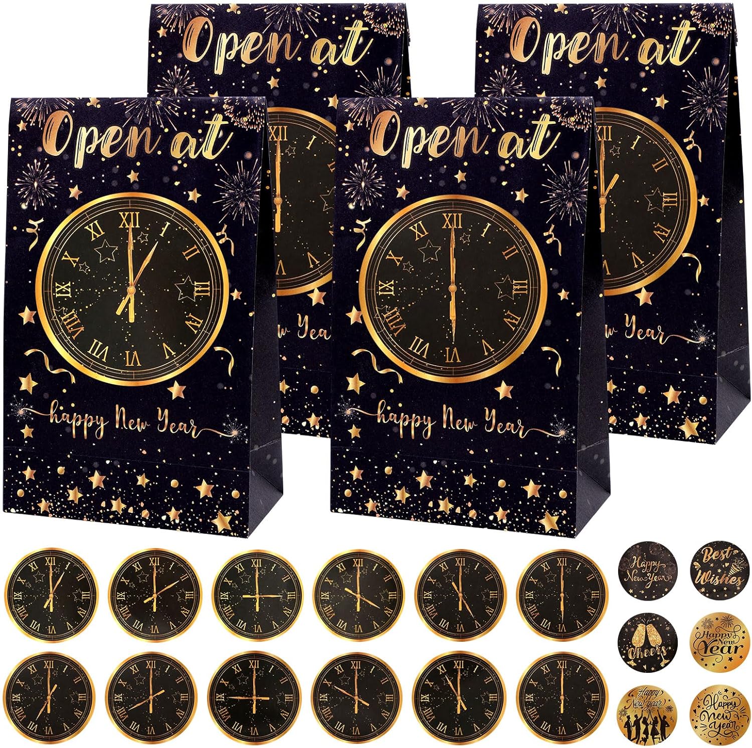 【Clock Countdown Design】The new year present bags feature a unique clock countdown sticker design, adding an extra festive touch to your New Year’s Eve celebration. This design element highlights the excitement of the countdown to midnight, making these bags a thematic addition to your party.