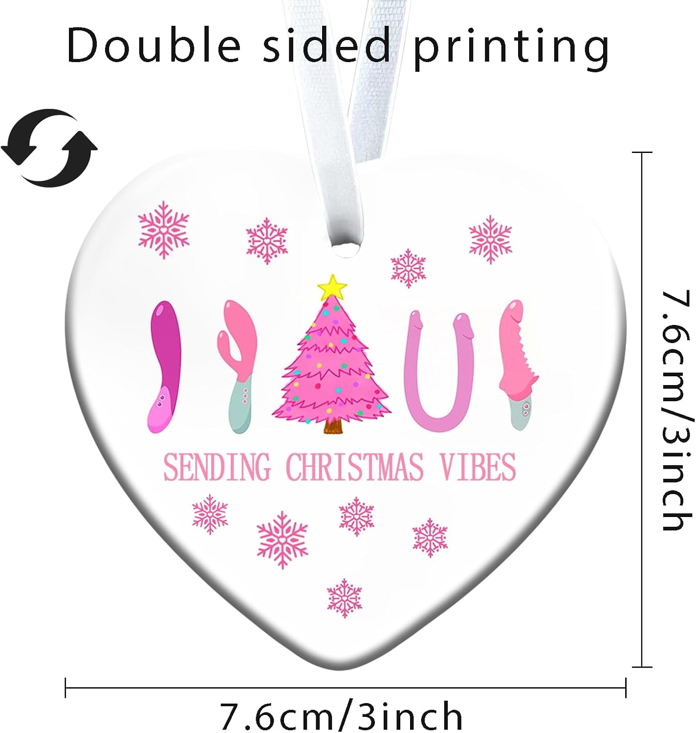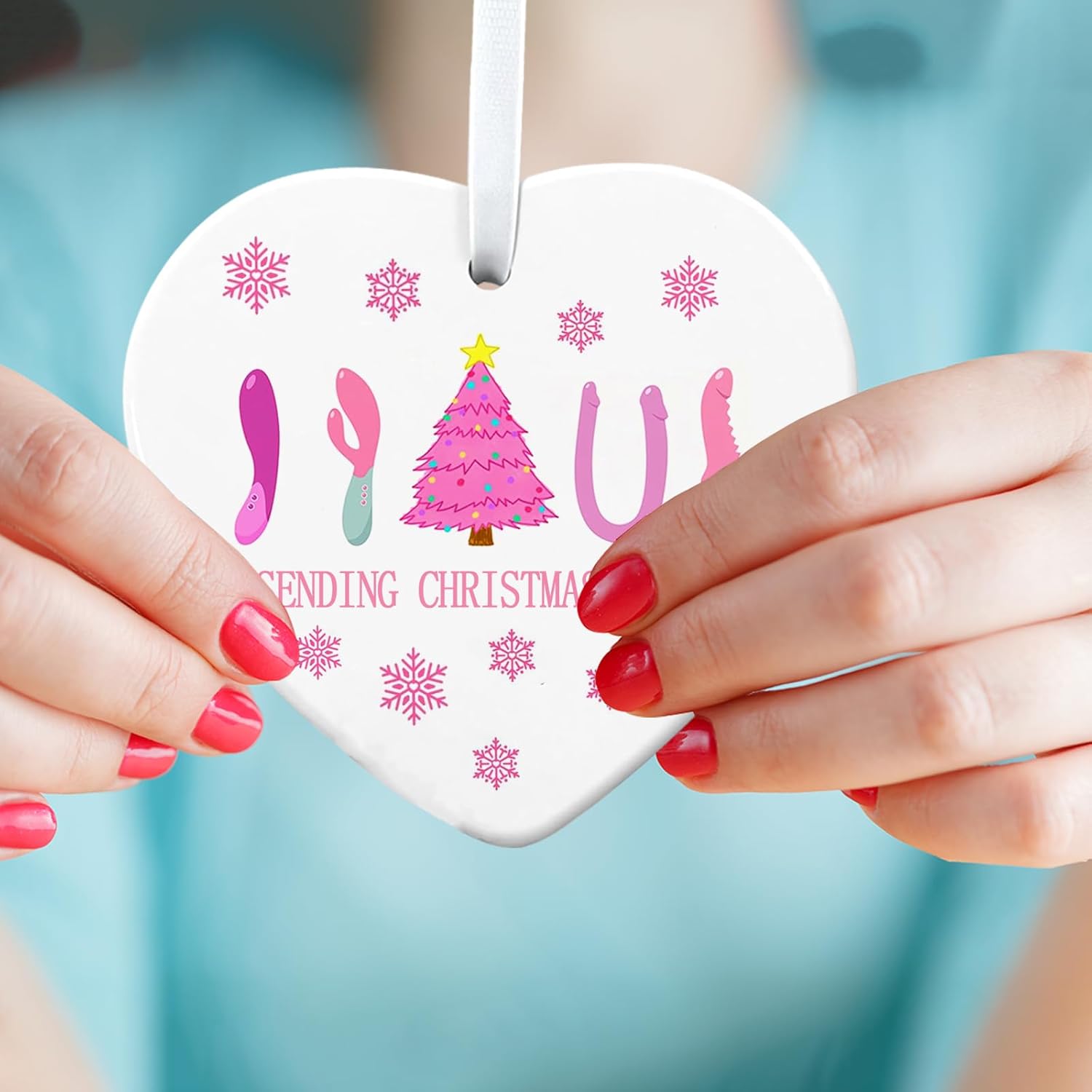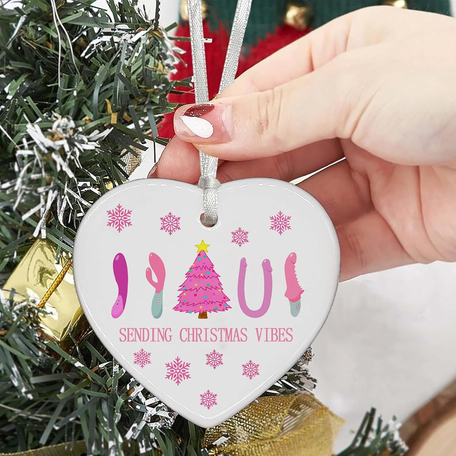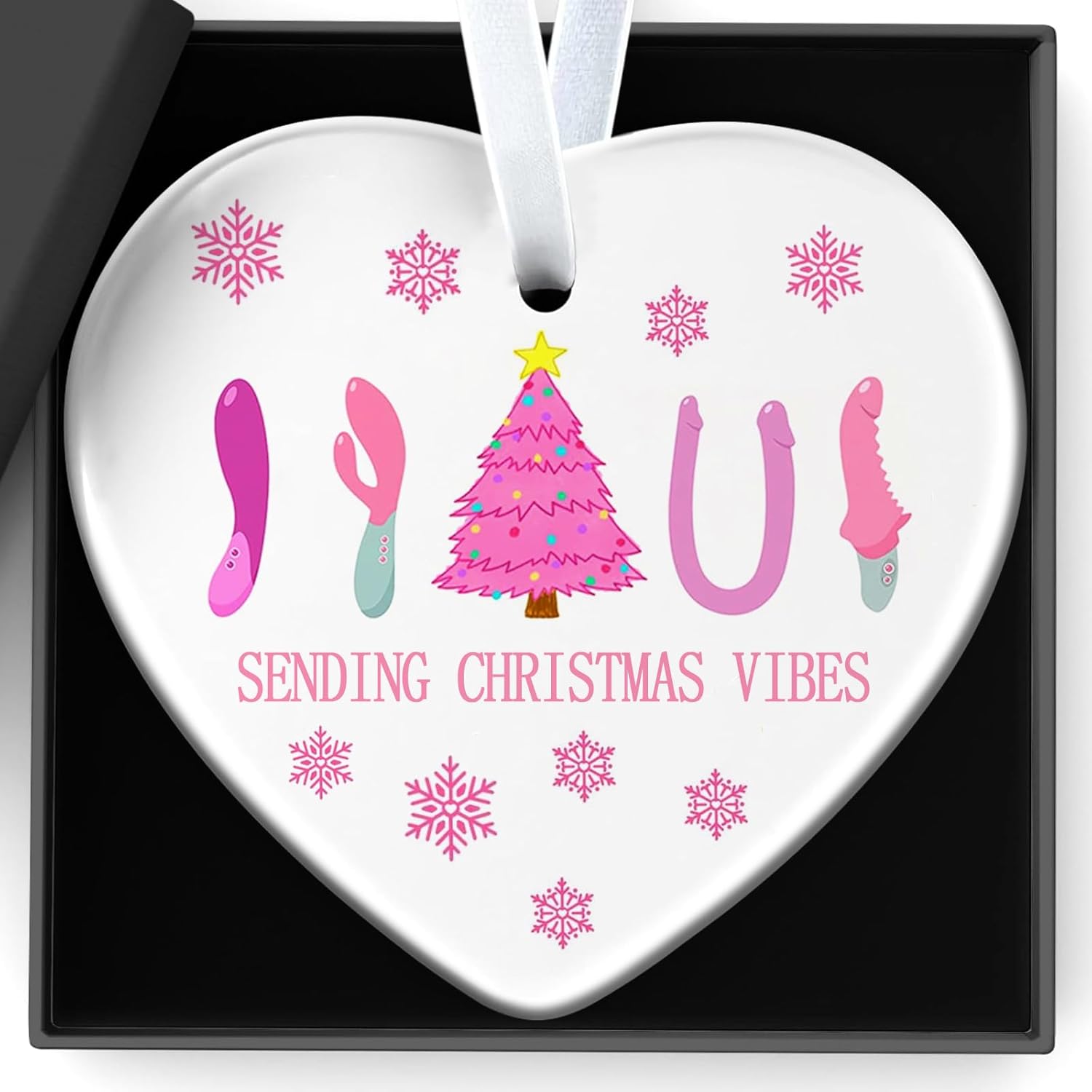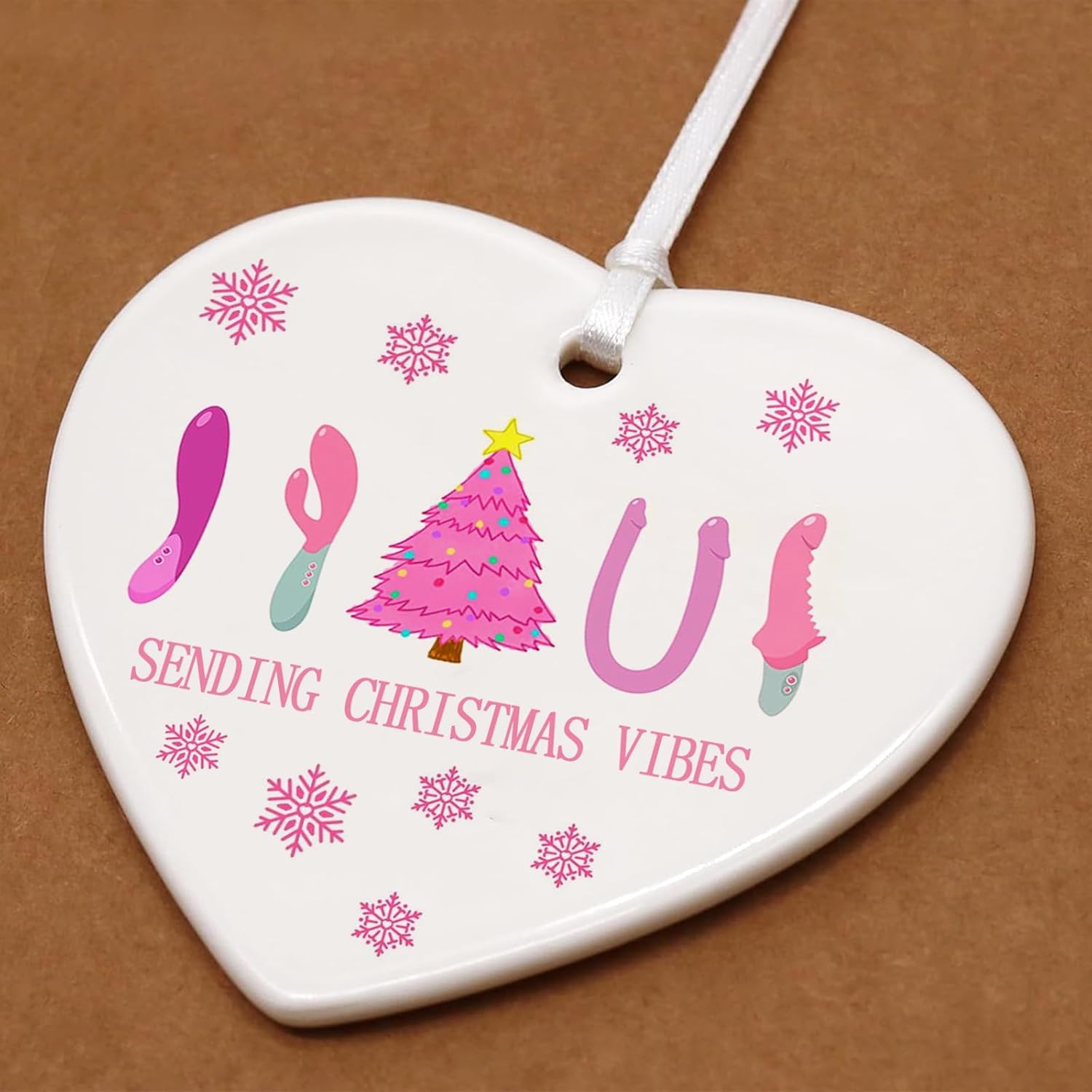 Funny Adult Christmas Gift: This heart-shaped ceramic ornament features a playful and cheeky design with a Christmas tree, Santa hats, and novelty adult accessories, making it a funny and unique choice for adults.