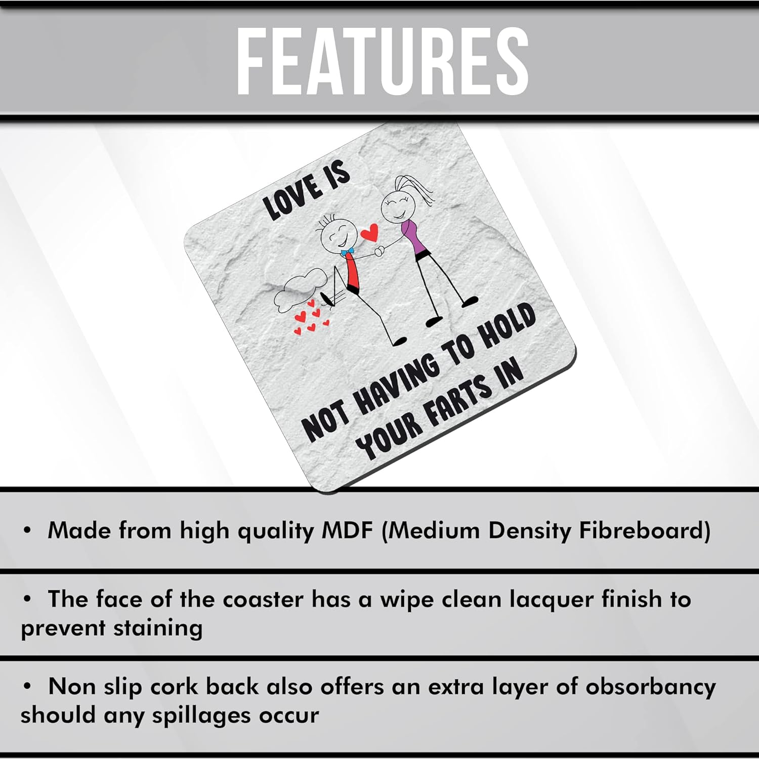 Introducing our humorous and light hearted drinks coaster, designed to bring a smile to your face while protecting your surfaces. This coaster features a playful and cheeky message: “Love is not having to hold your farts in.”