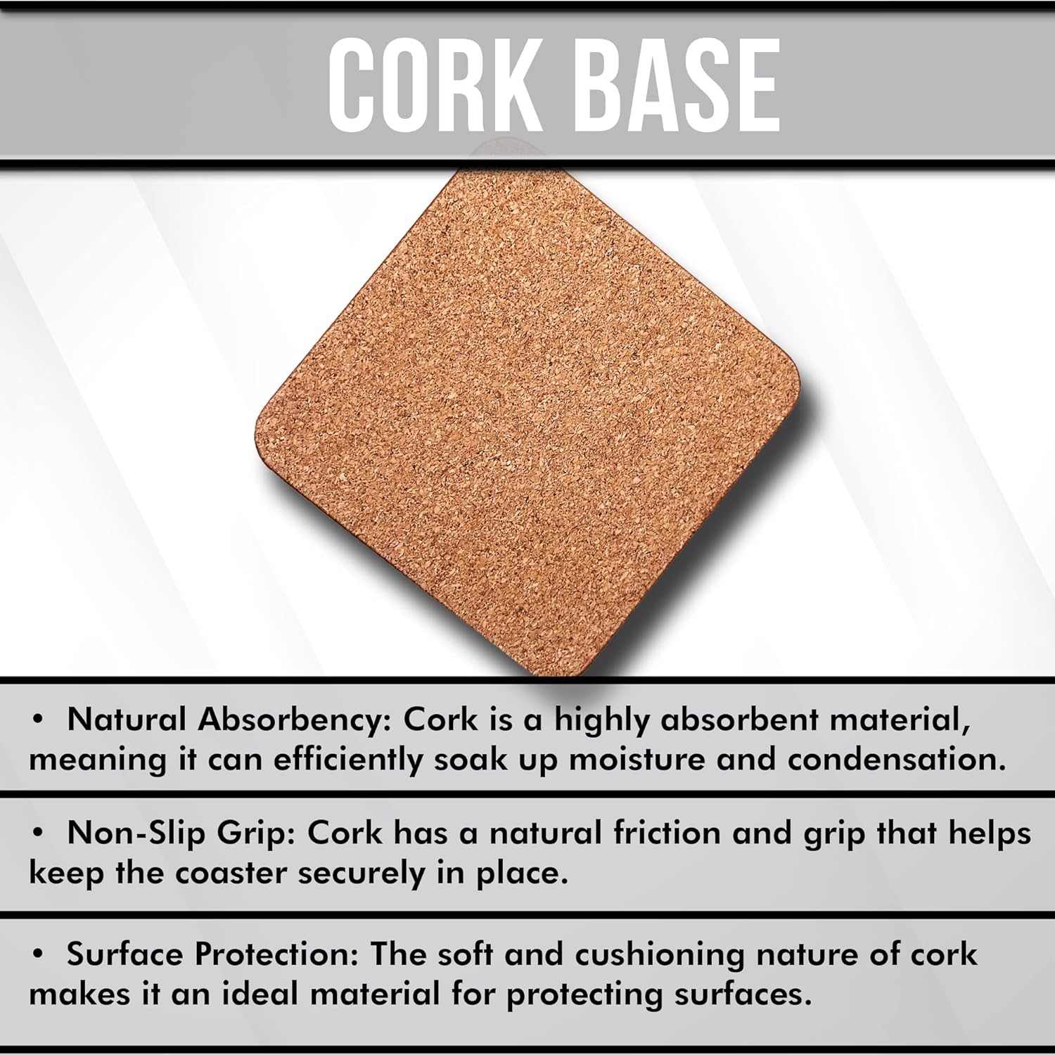 The underside of our coaster features a natural cork backing, carefully chosen for its numerous benefits and functionality. This cork layer serves as the unsung hero, enhancing the coaster’s performance and protecting your surfaces.