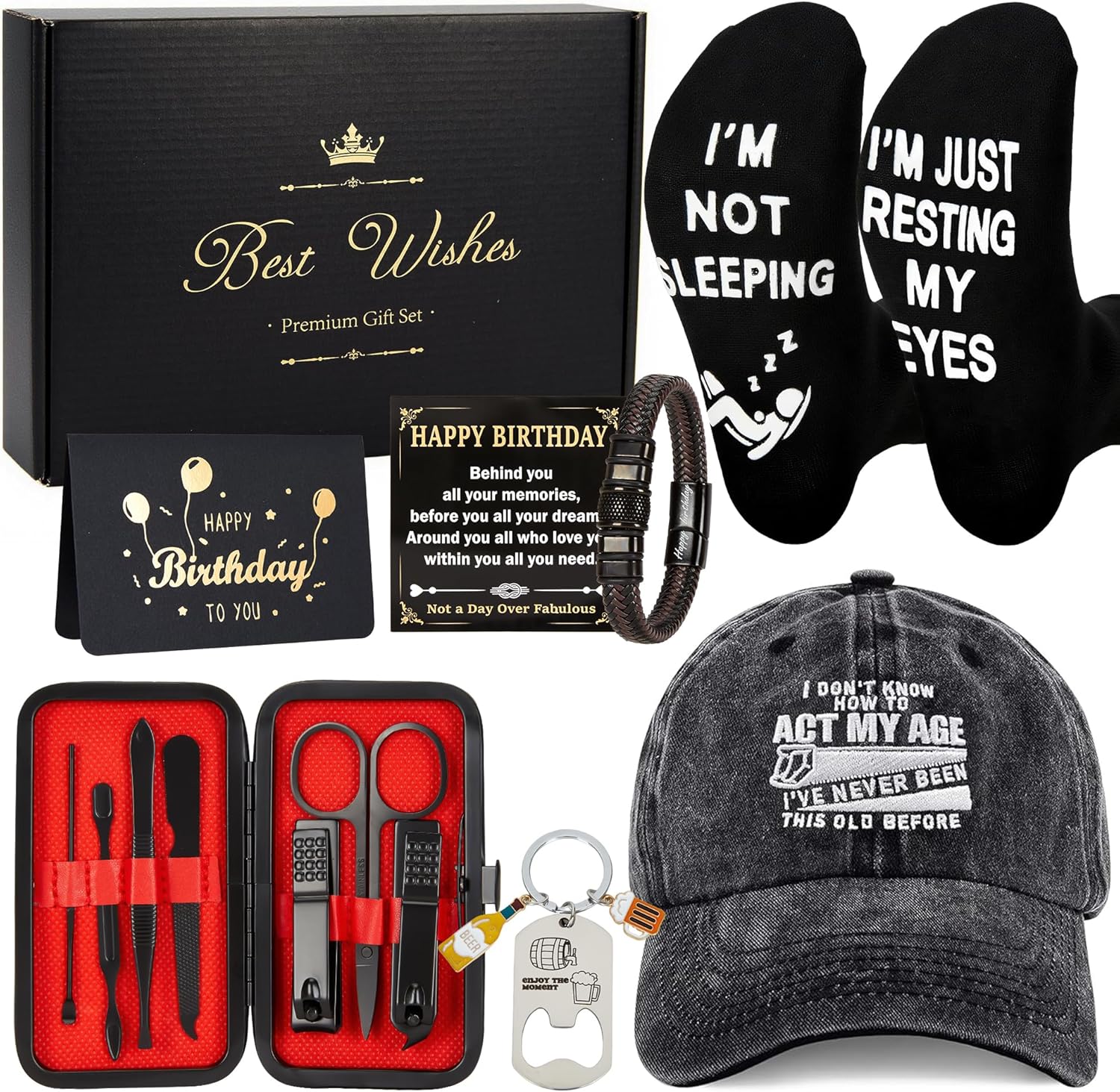 Gifts for Men – 7-Piece Gift Set with Baseball Cap, Socks, Bracelet, Keychain, Manicure Tools & Greeting Cards – Perfect for Birthdays, Father’s Day, Christmas, Retirement for Dad, Husband, Grandad
