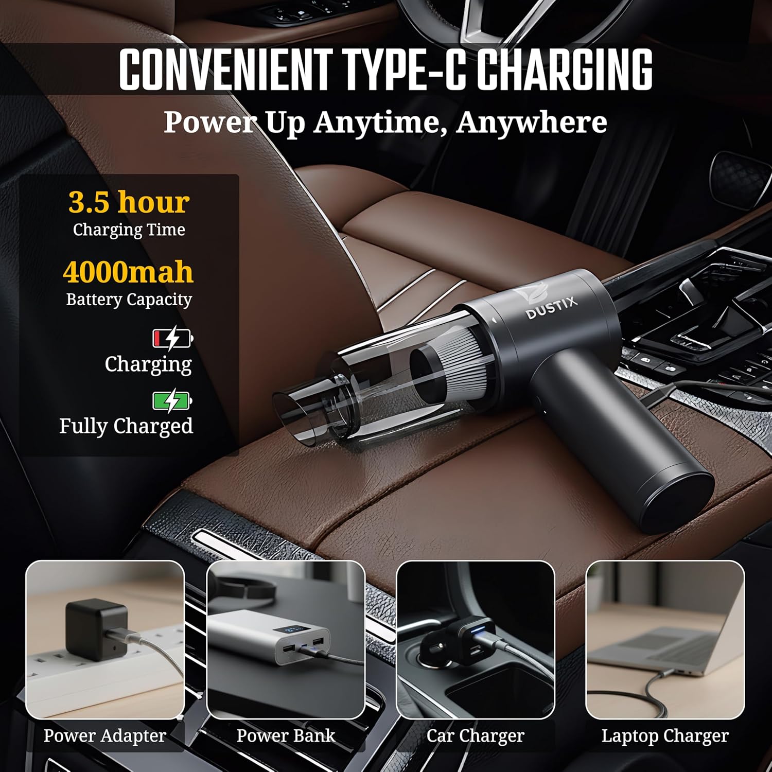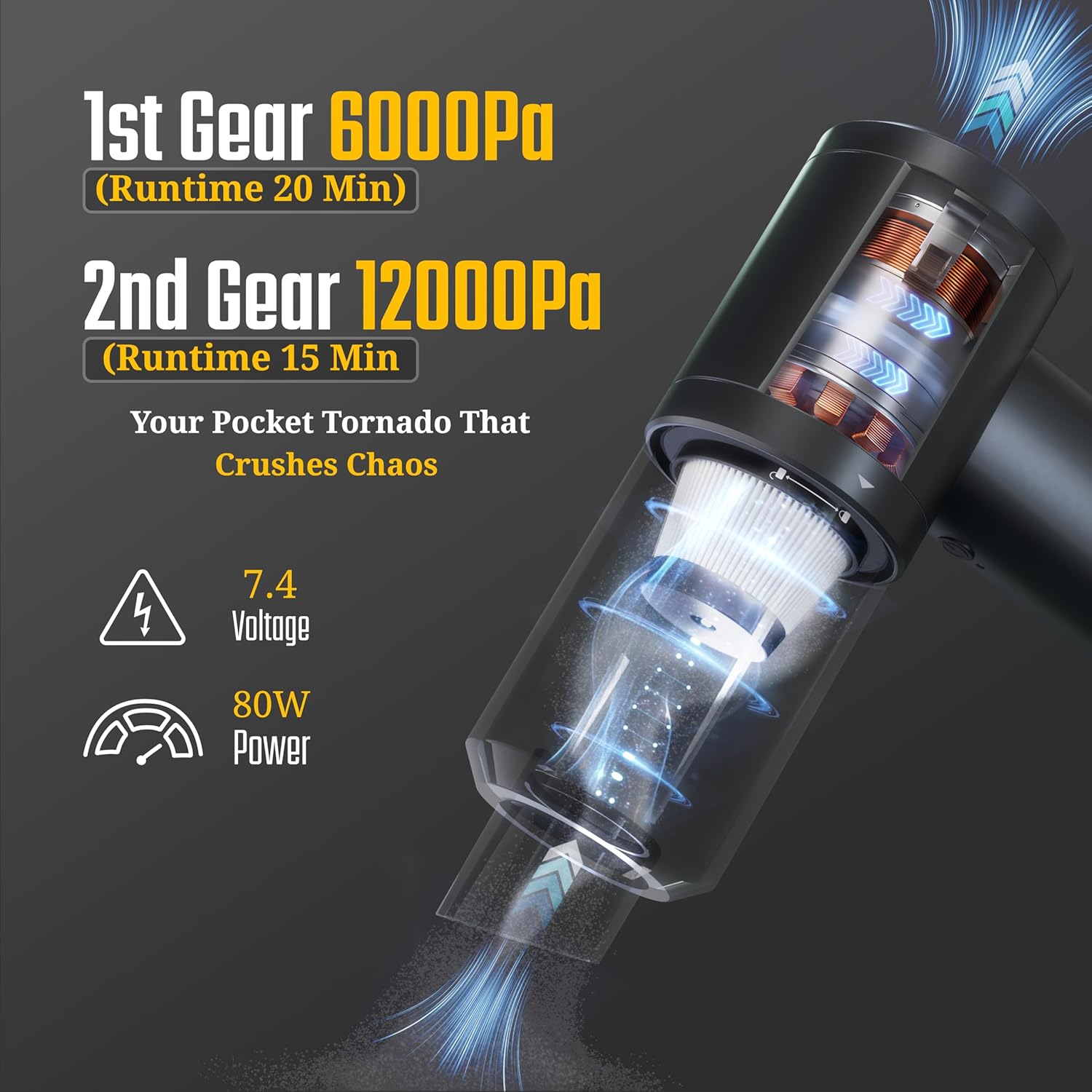 Dual-Mode Suction: Advanced brushless motor delivers 6000Pa on first gear and 12000Pa on second gear, making it a powerful handheld vacuum cleaner, car vacuum cleaner cordless powerful, car hoover powerful, and best car vacuum cleaner for dust, crumbs, pet hair, and debris.