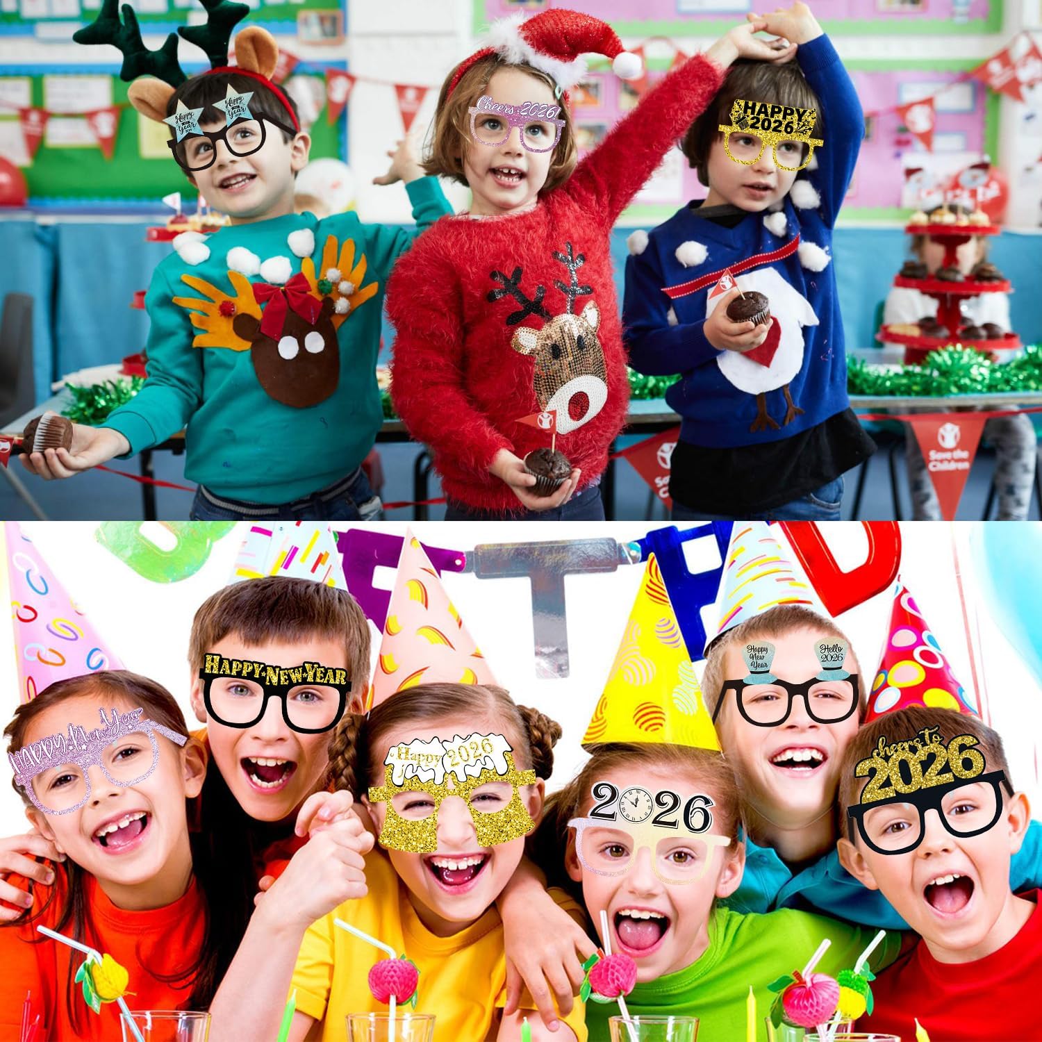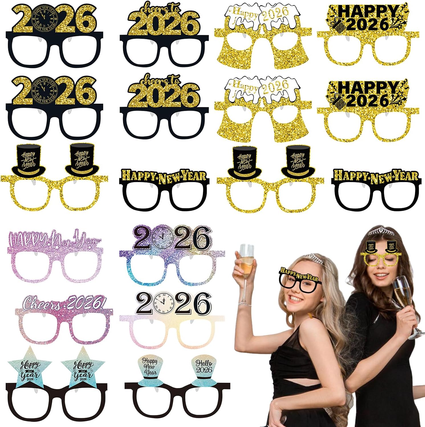 Happy New Year Party Paper Glasses, Funny Glitter 2026 Eyeglasses Fancy Photo Booth Props Glasses for Kids Adults New Year Party Decorations (18 Pack Paper Glasses)