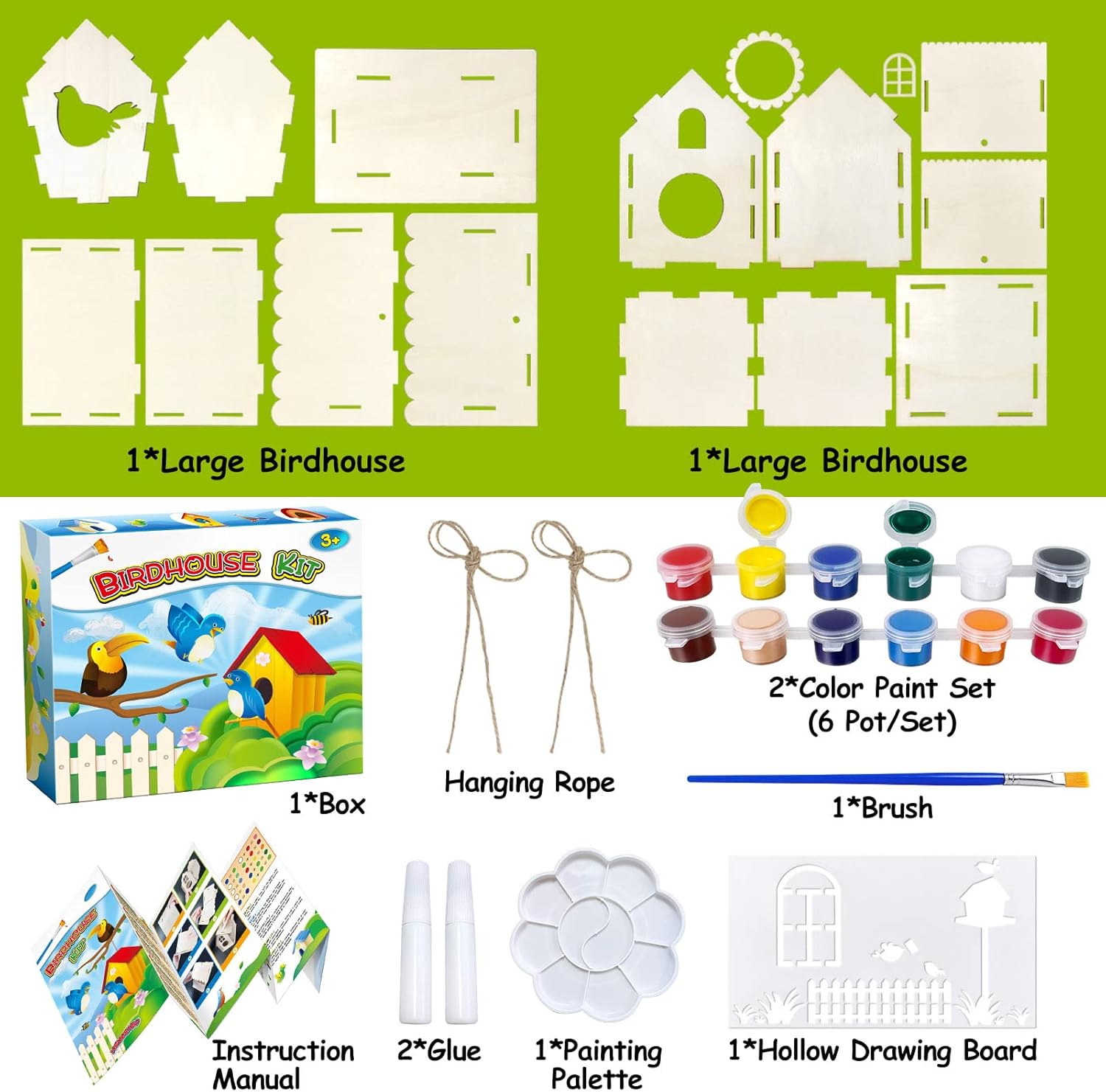 SUPER VALUE BIRDHOUSE ART CRAFTS SET – The Kids craft kits includes everything you need to create your own personalized Bird House! 2 unassembled birdhouses with 12 paints, 1 palette, 1 brushes, 2 strings, 2 glues, a color page manual and delicate color box. These tools are sufficient to help you assemble the birdhouse and draw the patterns you imagine