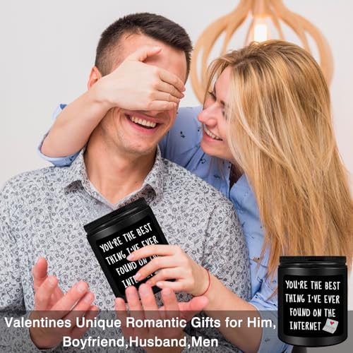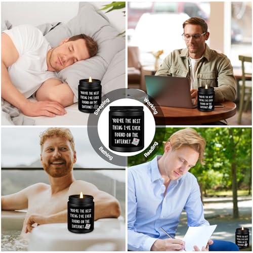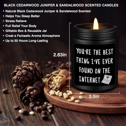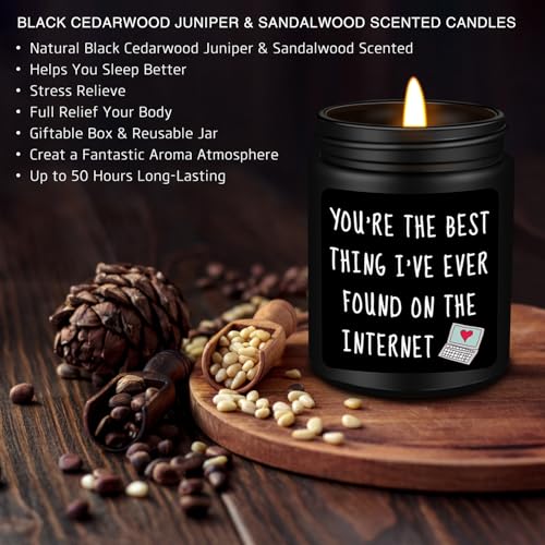 Valentines Anniversary Birthday Gifts for Him: Premium quality black cedar juniper sandalwood scented candles make great gifts for men. This funny scented candle features a witty and meaningful phrase to make him smile: You’re the best thing I’ve ever found on the internet. Personalized gifts for men, gifts for him, best friends, boyfriends, husband, fiancé, teacher, coworker, boss, neighbor, classmate, brother or anyone else. Warm and humorous candles have a unique way of making him laugh