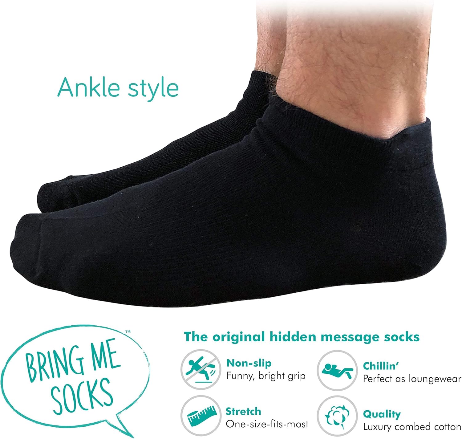 Most of our sock designs include a non-slip grip underfoot with amusing messages such as:
