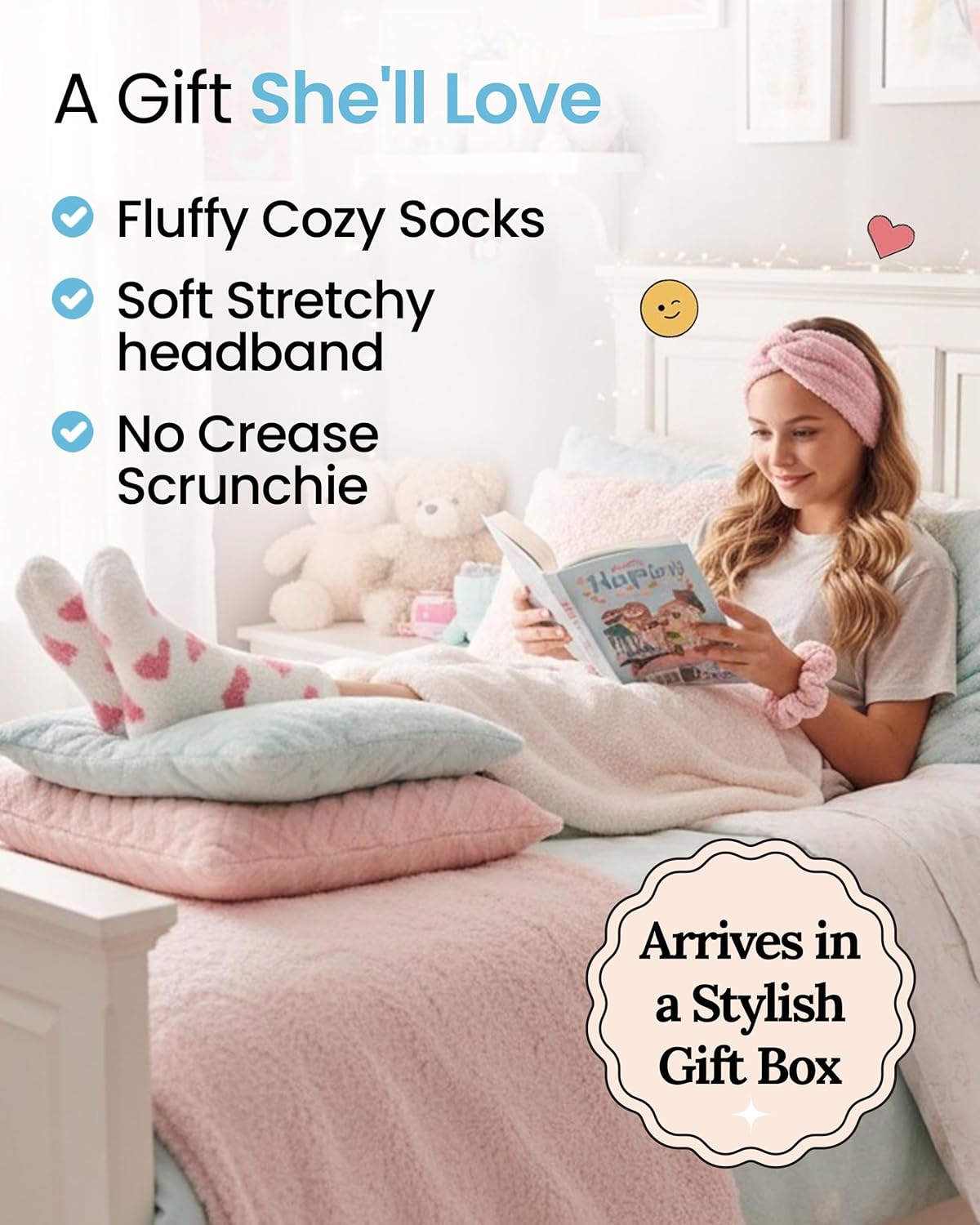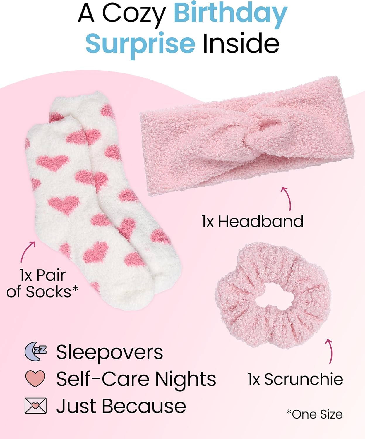 Celebrate her special day with cosy items she’ll love! Includes a pair of fluffy socks, a soft twist headband and a gentle, no-crease scrunchie designed for endless comfort