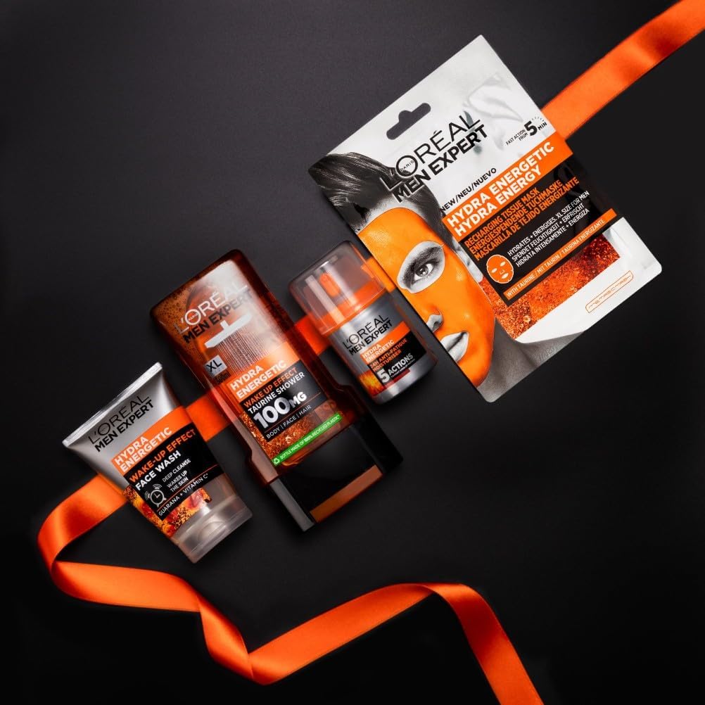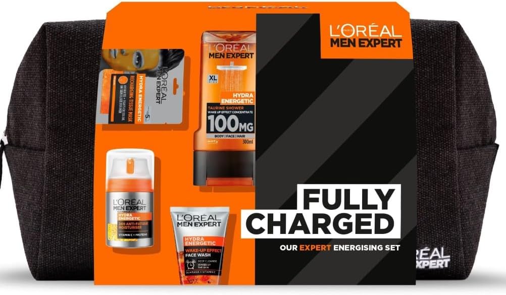 L’Oreal Men Expert Gift Set for Men, Hydra Energetic Fully Charged Washbag: Shower Gel, Moisturiser for Men, Sheet Face Mask and Face Wash