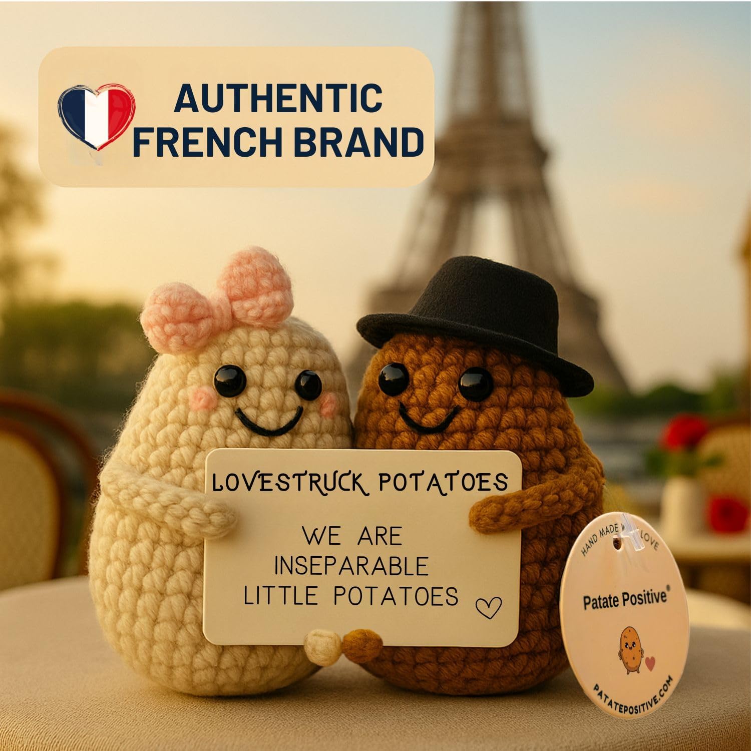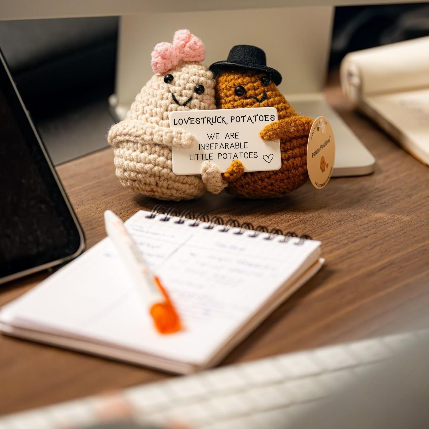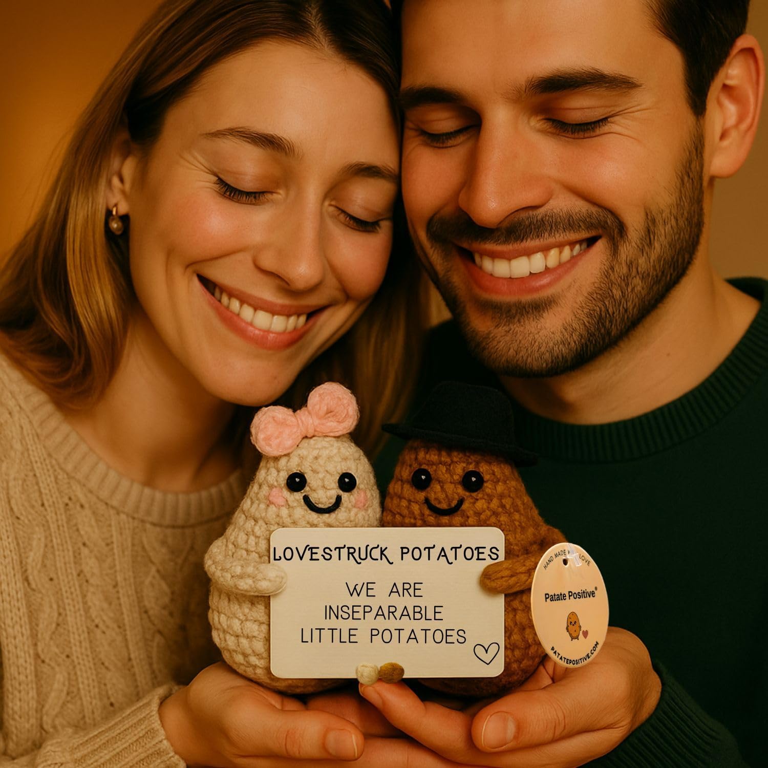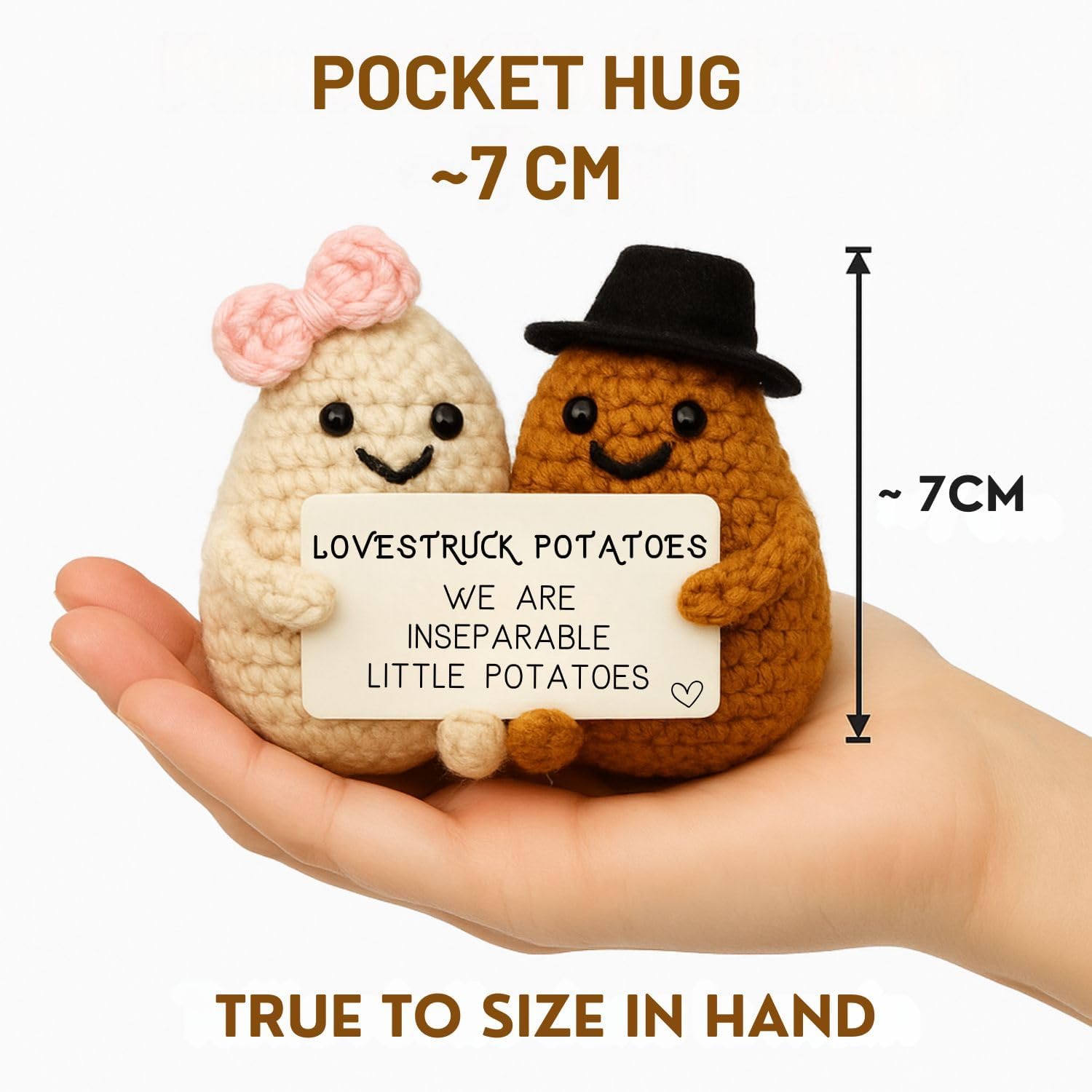 Looking for a gift that’s meaningful, playful, and heartwarming? These handmade crochet Love Potatoes are more than just plush toys — they’re a symbol of togetherness, affection, and the kind of love that doesn’t let go. Whether it’s a surprise for your partner, girlfriend, boyfriend, husband, wife, or long-distance partner, this pair of tiny potatoes delivers a message that sticks: *“We’re two little potatoes that can’t be apart.”* Crafted with care and packed with love, they make the perfect romantic gift for: – Valentine’s Day – Anniversary – Wedding or nuptials – Reconciliation after a breakup – Or simply… *“Just because I love you.”* — ❤️ What Makes Them So Special? – A funny and emotional message that melts hearts and brings smiles – A unique gift idea for couples, lovers, and long-distance relationships – Crocheted by hand with soft yarn – no two pairs are exactly the same – Perfect as a pocket hug, love-themed decoration, or relationship keepsake – Great for him, her, your fiancée, or even a surprise for your secret Santa — 📦 What’s Inside? – 2 plush crochet potatoes (one with a red bow, one with a black hat) – A printed card held between them: “We are two inseparable little potatoes” – Approx. 2.7 inches tall (7 cm) – Soft, light, and ready to gift with love 💘 — 🧸 Please Note – Decorative item – not suitable for children under 3 – Designed to inspire hugs, tenderness, and emotional reactions — every time someone sees them. 💘 Add to cart now and surprise your loved one with the cutest love-themed plush gift on Amazon. A symbol of your strong bond — small, sweet, and unforgettable.