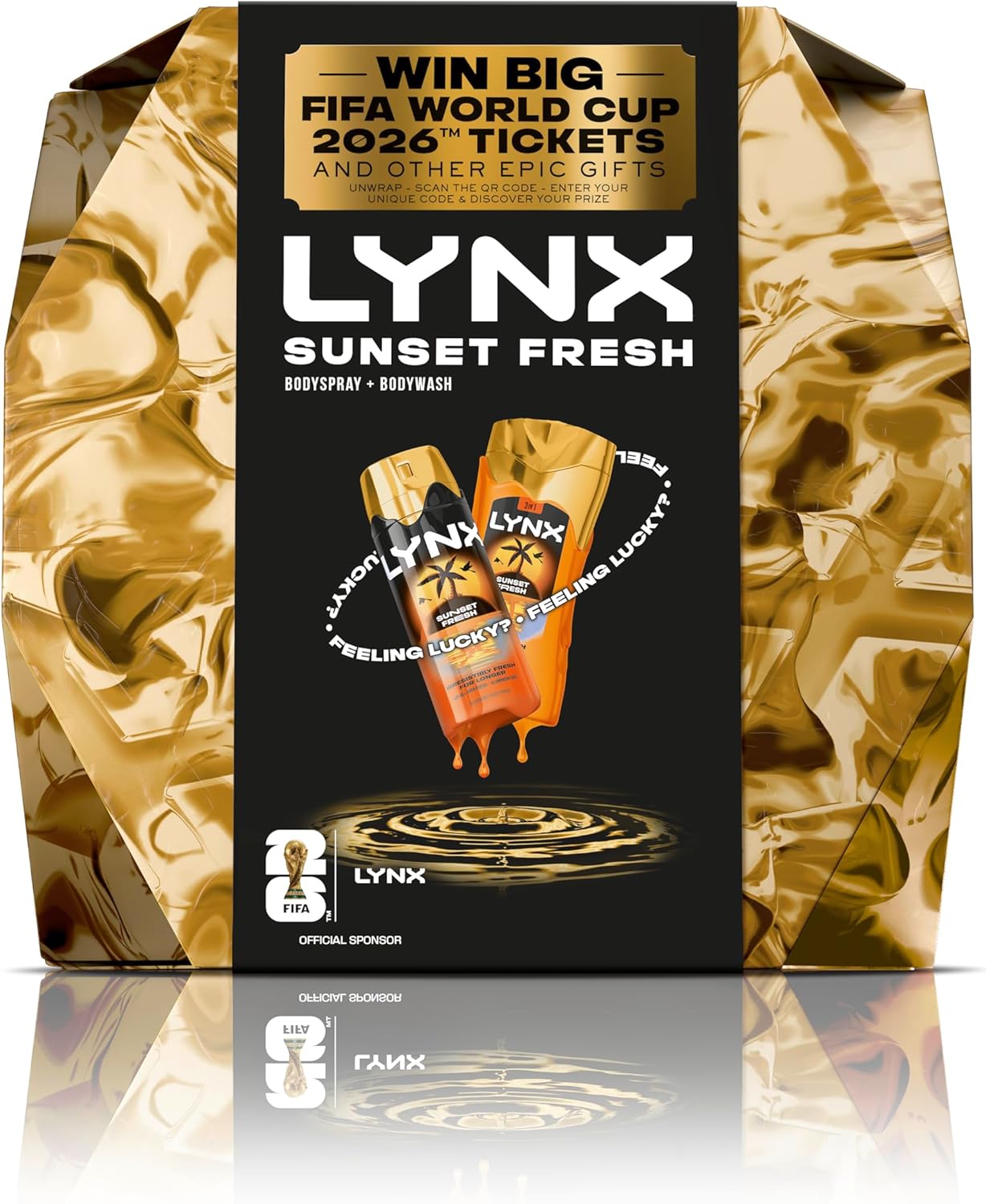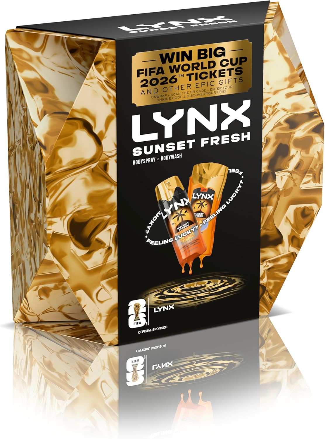 So, it’s gift-giving time again. The age-old question, ‘What will I get him?’ Relax. The answer’s simple. Time to take the guesswork out of getting it right and grab LYNX The Sunset Fresh Win Big Gift Set. Teaming full-size LYNX Sunset Fresh Body Wash and Deodorant Body Spray together, this set of gifts for him has got him covered with a long-lasting mango and mandarin scent, blended with the signature LYNX effect to leave you wanting more. But it doesn’t stop there, this gift set also includes a chance to win FIFA World Cup 2026™ Tickets plus other epic prizes.* With just a few spritzes of our men’s deodorant spray, you’ll have 48 hours of freshness and unbeatable confidence. We’re out here working smarter, not harder, with an aluminium-free formula that boasts even more odour-busting zinc technology than before. Turn your shower into a tropical retreat with LYNX Sunset Fresh 3-in-1 Body Wash. This hair, face and body cleanser kicks odour to the kerb and leaves you smelling irresistibly fresh for up to 12 hours. No matter how big or small life gets, you’ll always feel refreshed. Better still, this body cleanser contains moisturisers to hydrate your skin every time you shower.* *UK 18+. Opens 12:00, 6.8.25, Closes 23:59, 28.2.26. Purchase required. Retain pack containing unique code for entry. To enter, purchase Lynx Win Big Sunset Fresh Gift Set (whilst stocks last) and complete form at https://www.lynxformen.com/uk/winbig.html. Prizes: 10 trips for 2 to a FIFA World Cup 26™ Quarter Final match in the USA (‘Top Prize’); 150 Xbox packages; 250 x £100 cash; 1,000 £10 Amazon vouchers; 10,000 £5.95 Lynx vouchers and ~1m £1 Lynx vouchers. Top Prize: 2 FWC26™ Quarter Final tickets, 2 return flights from UK airport, 3 night 4* hotel stay, £1,000 spending money. Excludes visas & all other expenses. Must have a valid passport and authority to enter USA. Additional FIFA T&Cs applicable. Max 1 Top Prize per person. Smartphone, Internet access, PayPal account required. For full T&Cs, see [lynxformen.com/uk/winbig/terms.html Promoter and Data Controller: Unilever UK Limited.