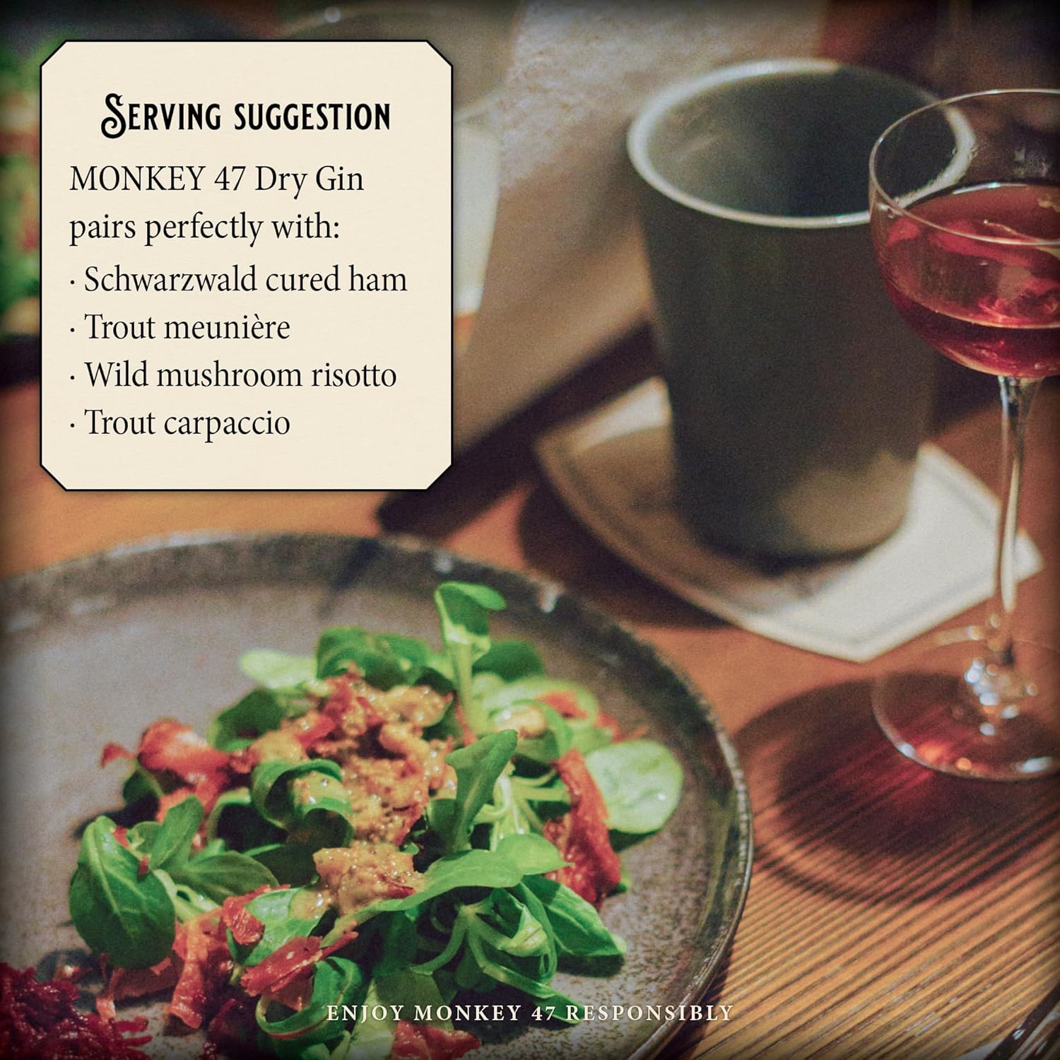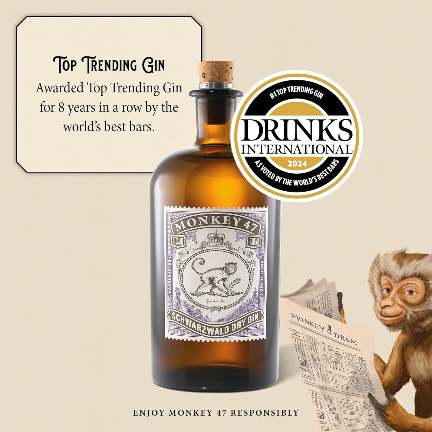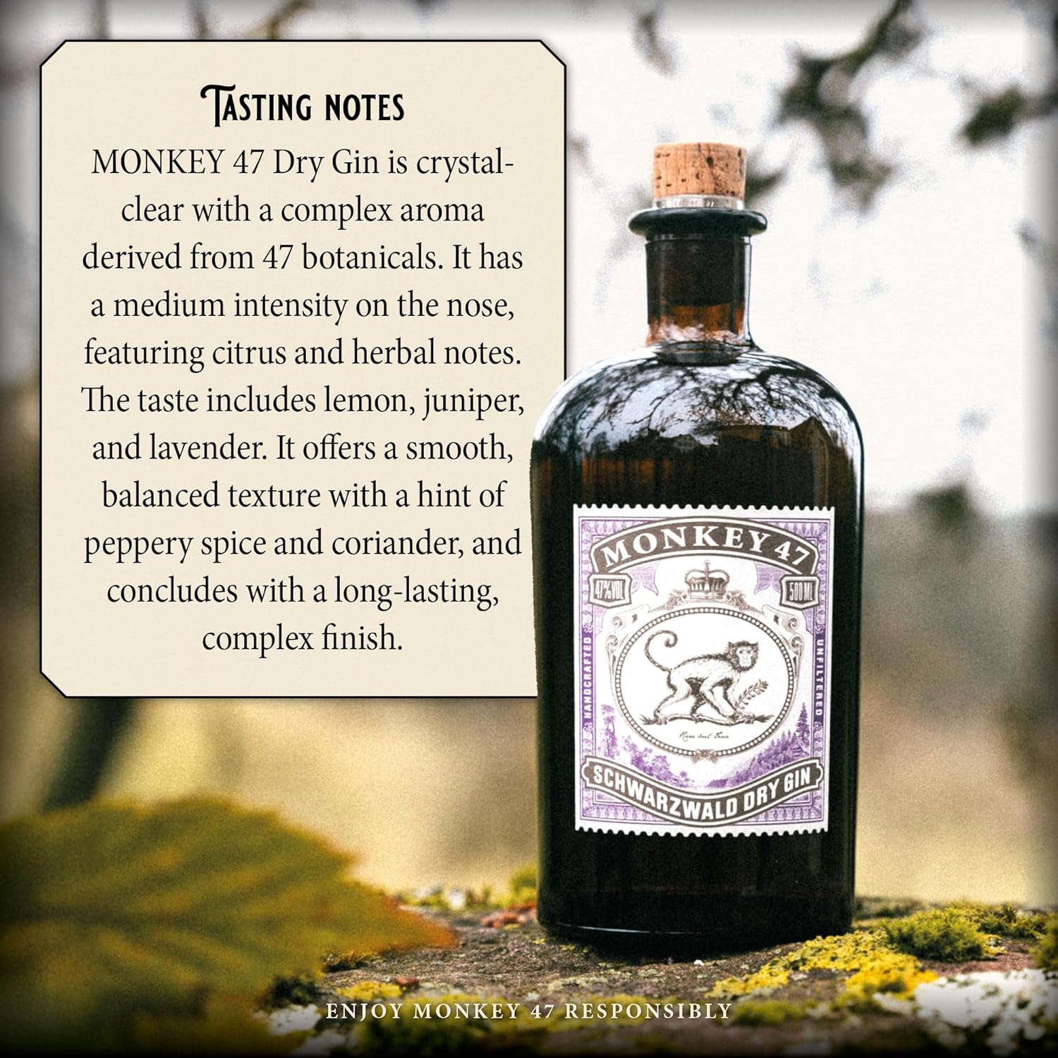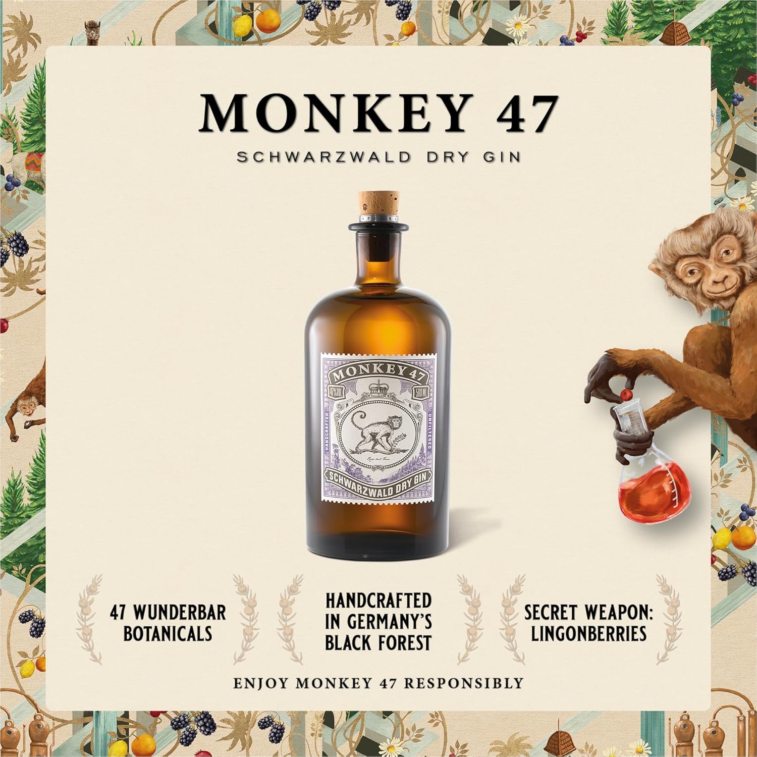 47 HAND-PICKED BOTANICALS blended with extremely soft spring water, give Monkey 47 Schwarzwald Dry Gin its unrivaled complexity and quality