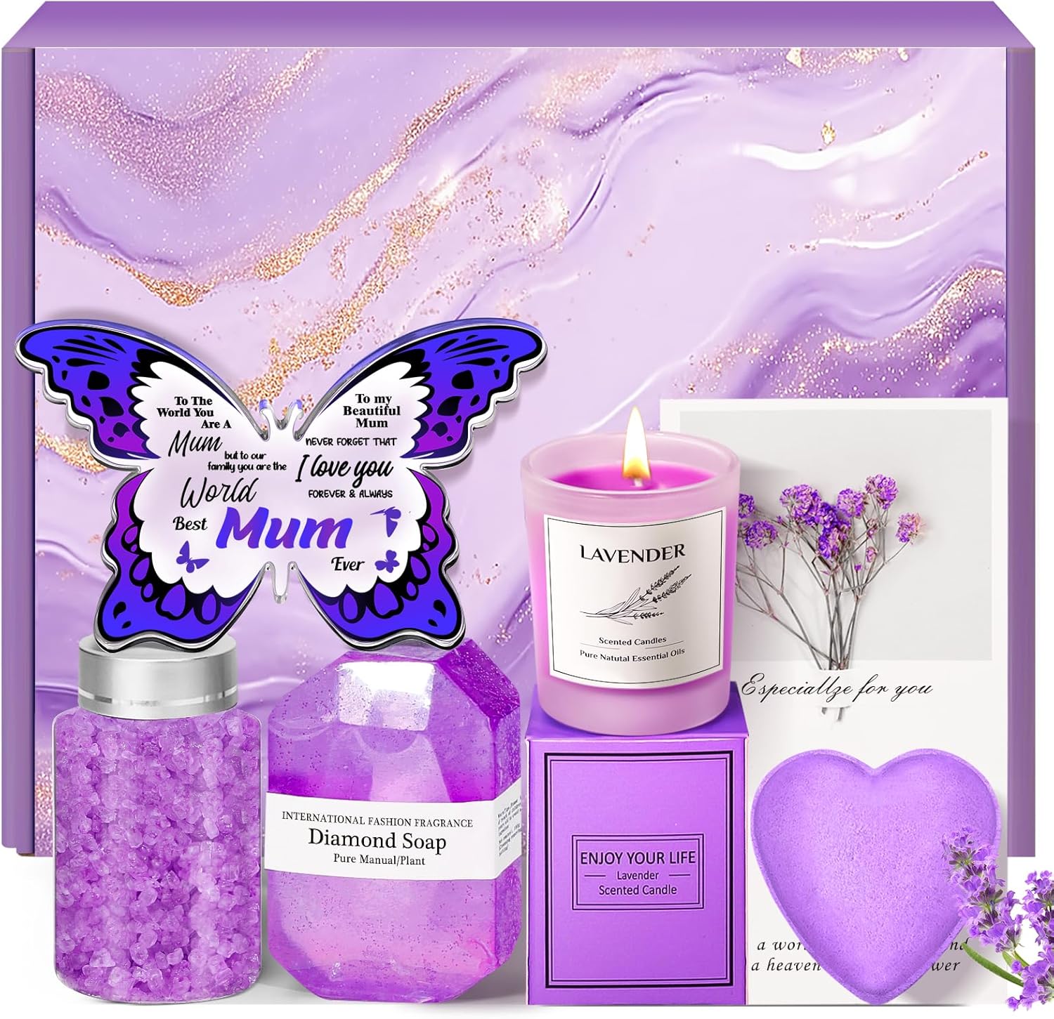 Thoughtful Mothers Day Gifts: The Lavender Scented Candle is Made of Natural Essential Oil, Heart-Shaped Bath Salt, A Bottle of Crystal Salt and Diamond Handmade Soap. This Pamper Gifts Set for Mum Will Offer Her Relaxing Home Spa Experience and Feel The Concern from Son or Daughter