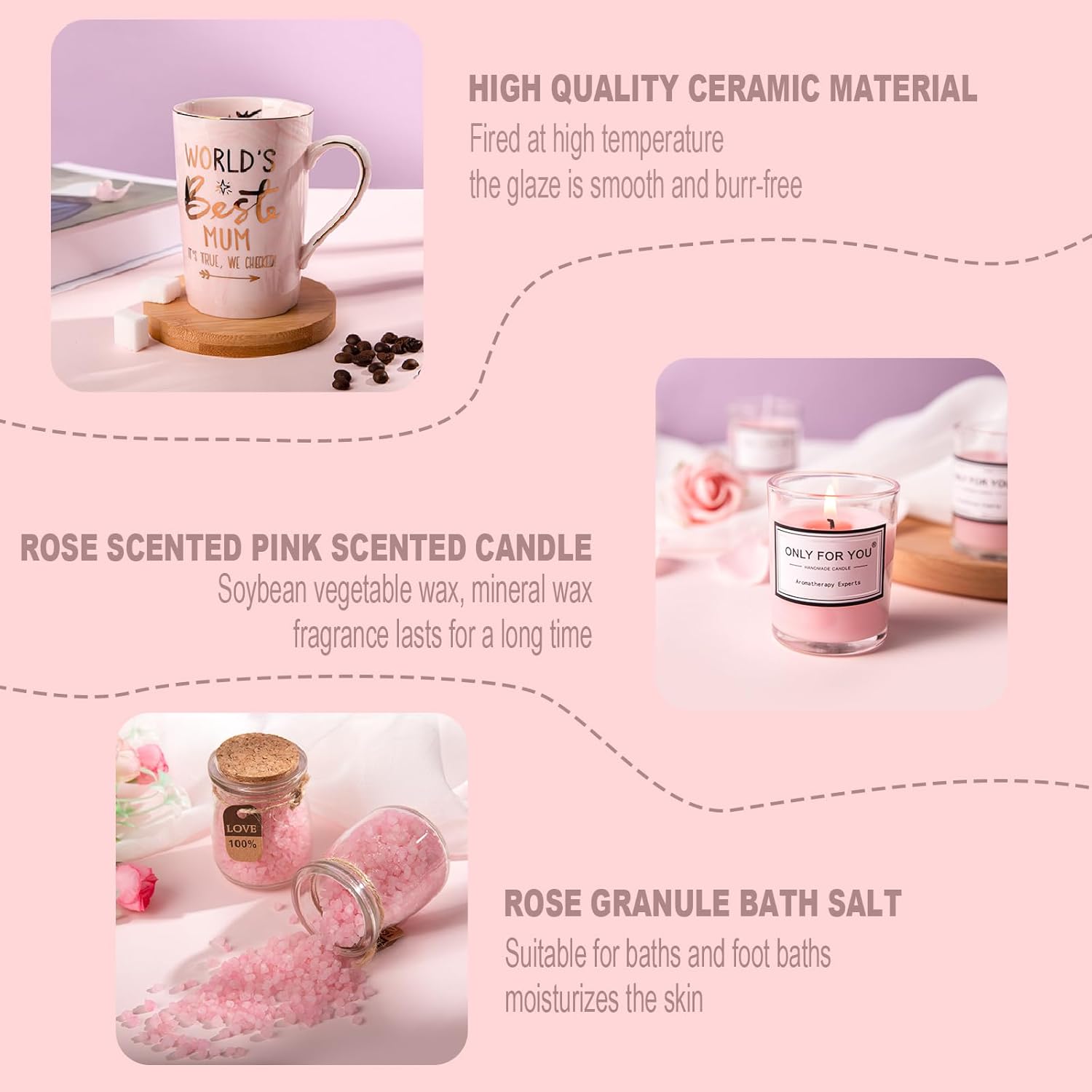 High Quality and Safe. We pay special attention to quality and safety, so we carefully select each product. The aromatherapy uses high-quality soybeans and has a pleasant aroma. Bath salts are natural, cleanse and moisturize the skin. The ceramic mug is made of high-quality porcelain clay, and the golden text will not affect its use in the microwave oven, which is both beautiful and convenient. We strive to satisfy our customers and provide an unforgettable gifting experience.