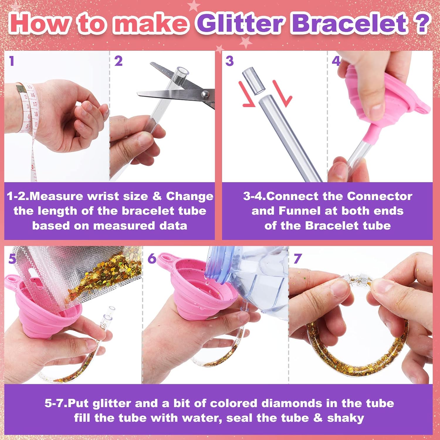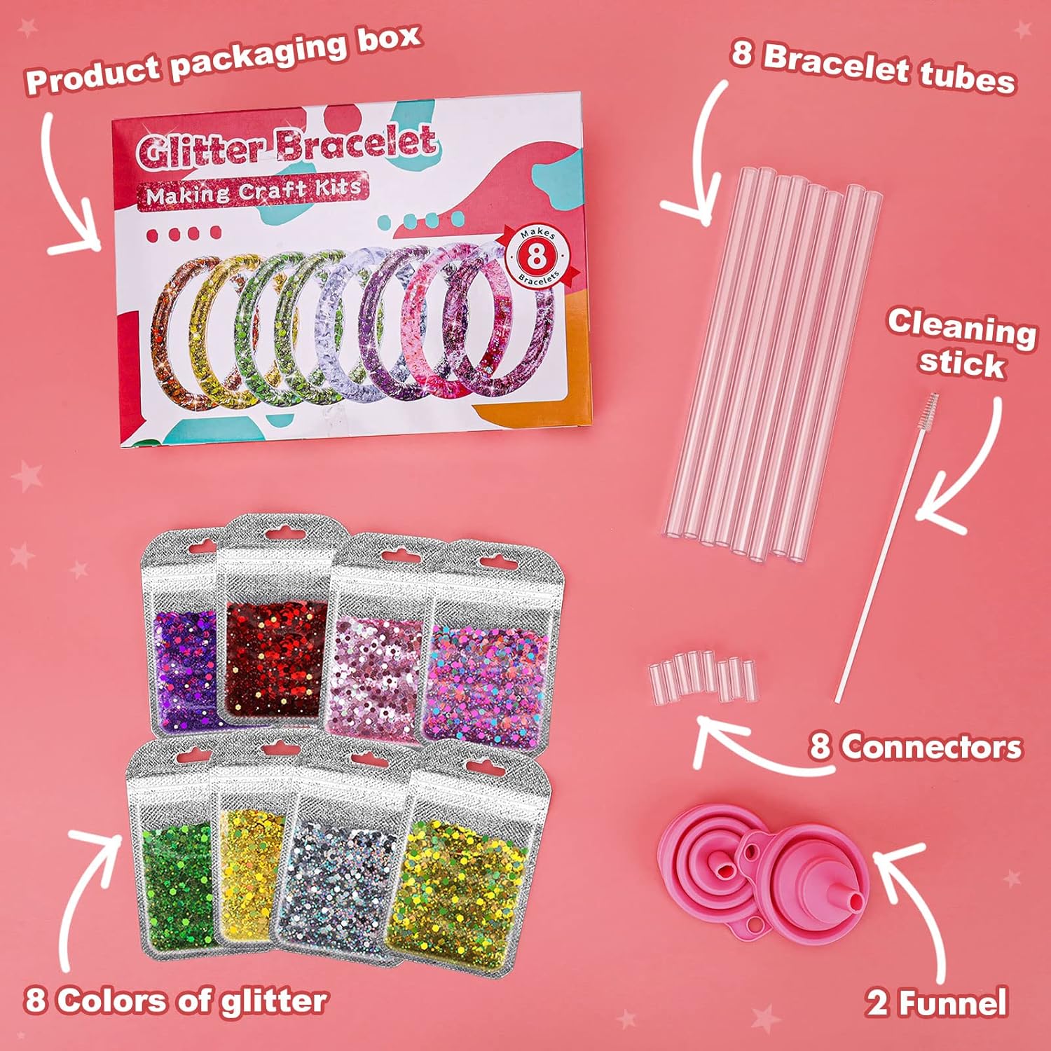 【Delicate Kid Bracelet Making Kit】The bracelet making set for kid includes the following accessories: instruction manual,1 cleaning brush,2 funnels,8 colors of sequins,8 transparent tubes,8 connectors.Our bracelet set has fewer small parts than other product sets,does not contain metal materials,the production process is not complicated.Our bracelet accessories are specially designed for girls from 5 years old.The perfect gift for girls Age 5-9.
