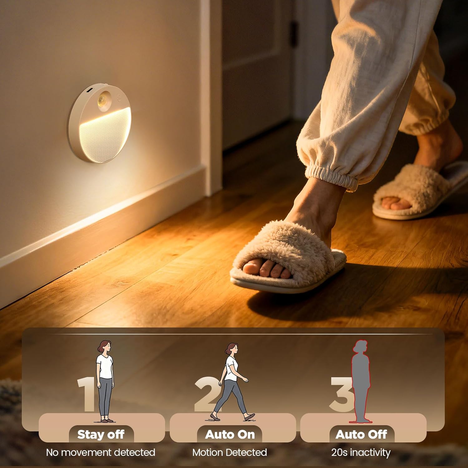 Auto Of/Off Mode: Activates automatically in darkness when motion is detected and turns off when no motion is detected in 20second. Perfect for midnight bathroom trips or navigating hallways.