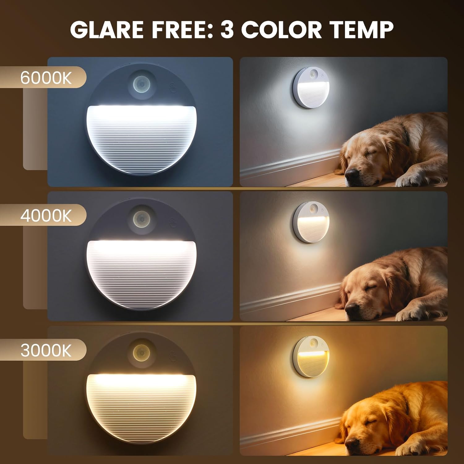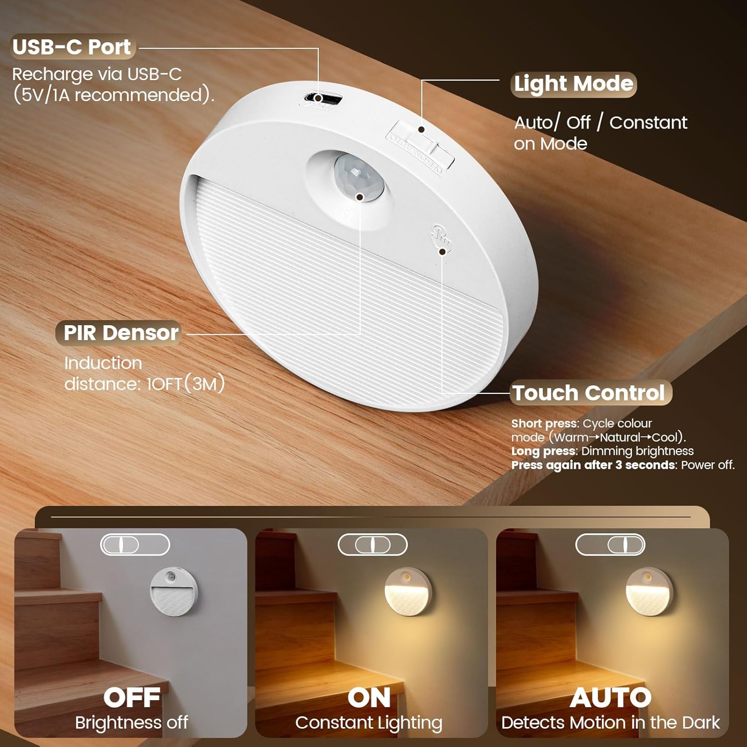 Adjustable Colours: Choose from Warm White (3000k cozy), Natural White (4500k balanced), or Cool White (6000k bright)—ideal for nurseries, stairs, or workspaces.