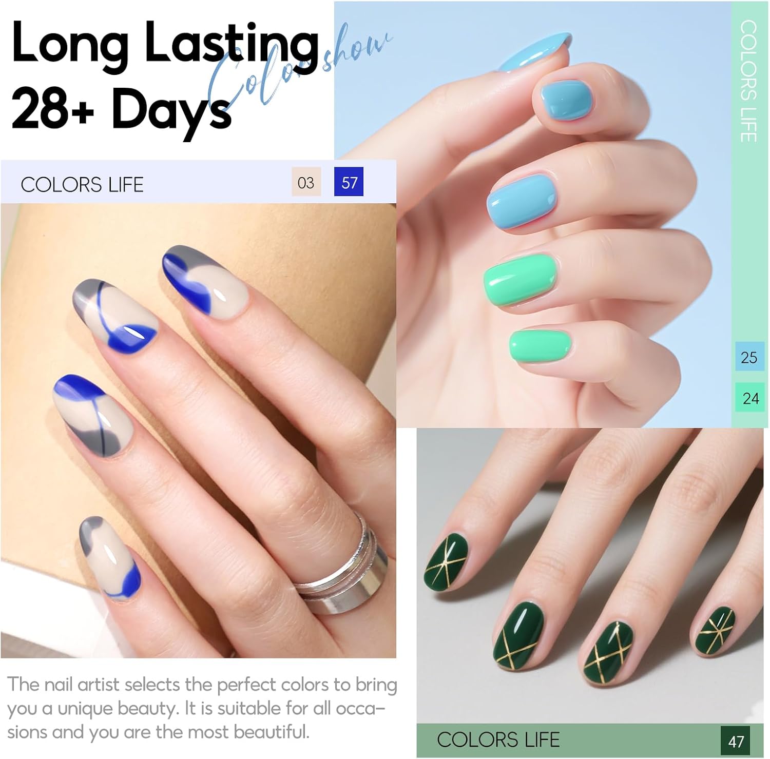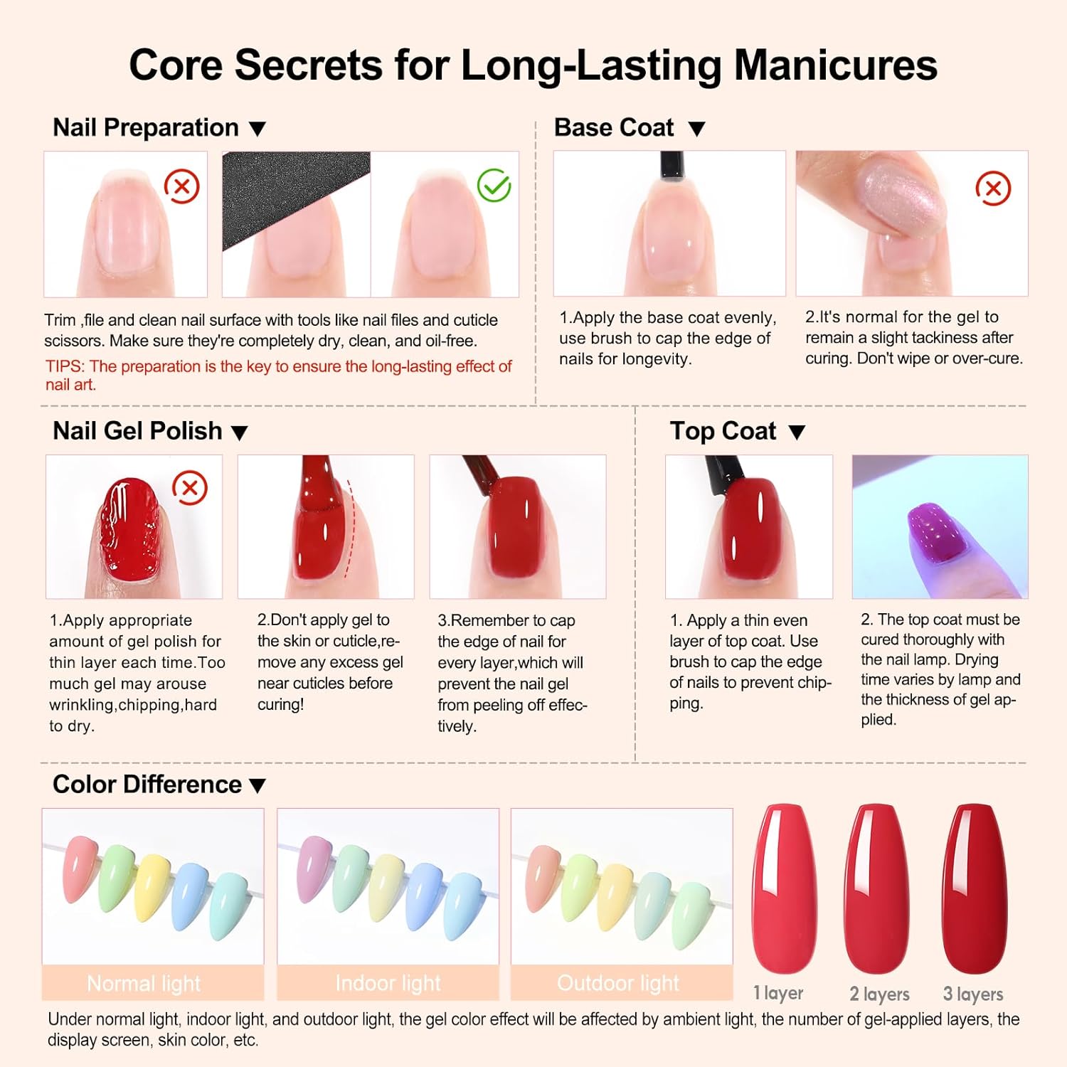Long-lasting Shine: Our gel polish kit is designed with beginners in mind. The smooth texture ensures easy application, while the formula adds strength and protects your nails. Please note: Need cure under U V light for 60-120 seconds.Last around 2-3 weeks if properly buffed your nail bed and applied base top coat.