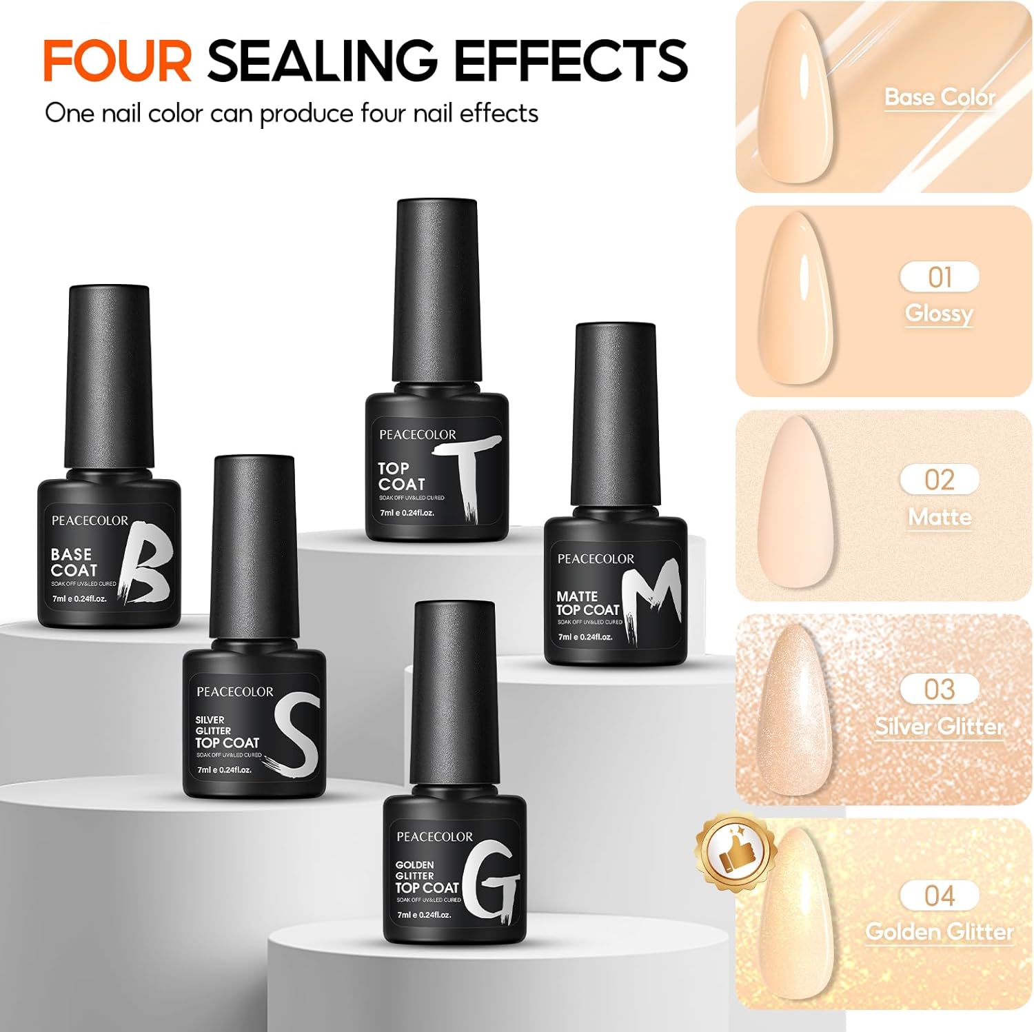 Glossy/Matte/Glitter Nail Effect: With 4 top coats, you can achieve a high-gloss shine, velvety matte look, or dazzling glitter effects. The matte and glitter top coat are suitable for Autumn winter and add variety to your nail designs. Combined with the 35 available colors, this nail kit allows you to create over 140 unique manicure combinations.