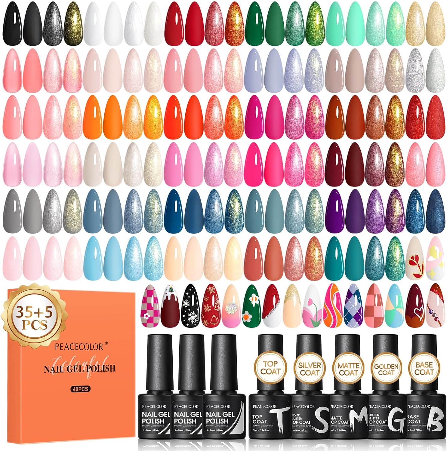 40PCS Gel Nail Polish Set: Gel nail kit includes 35 richly pigmented color nail polishes (7ml/bottle), base coat, glossy top coat, matte top coat, gold and silver glitter top coats. Whether you’re a beginner or professional manicurist, you can easily create your own custom nail looks with this versatile collection.