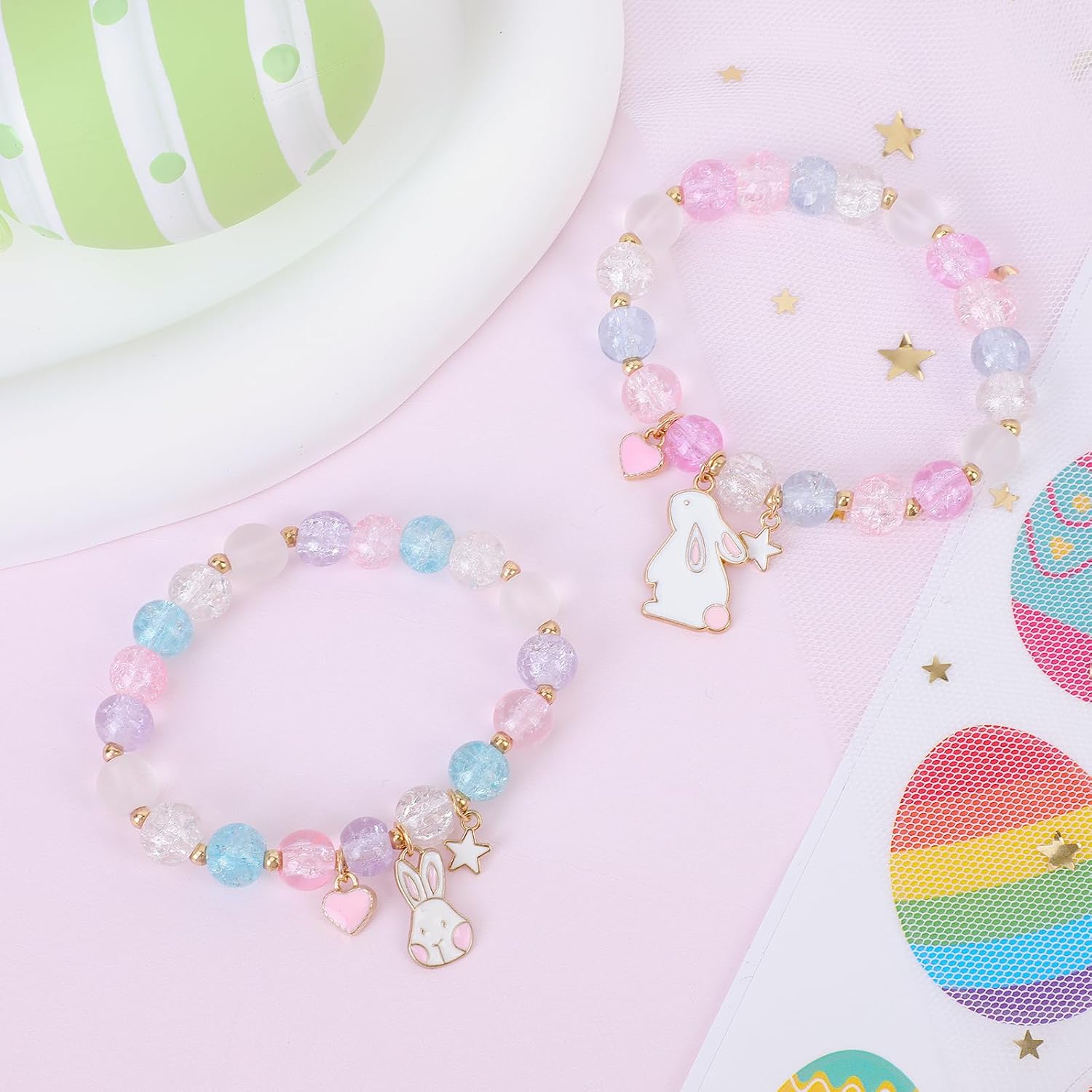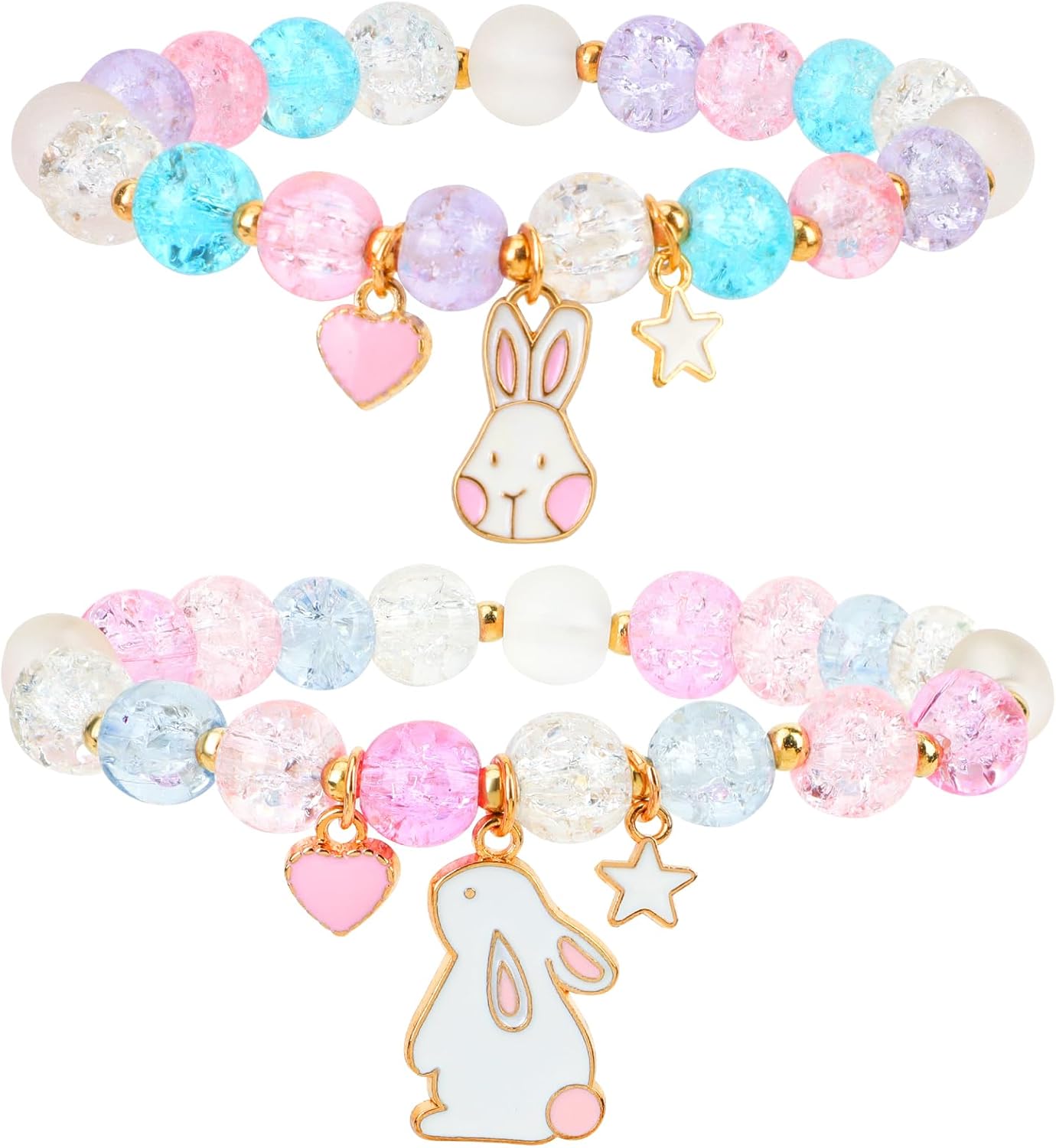 Pwsap 2PCS Colorful Bunny Charm Bracelets for Girls, Cute Easter Bunny Rabbit Crystal Bracelet with Elastic, Easter Basket Stuffer Jewelry Gift for Daughter Sister Niece Cousin Best Friends