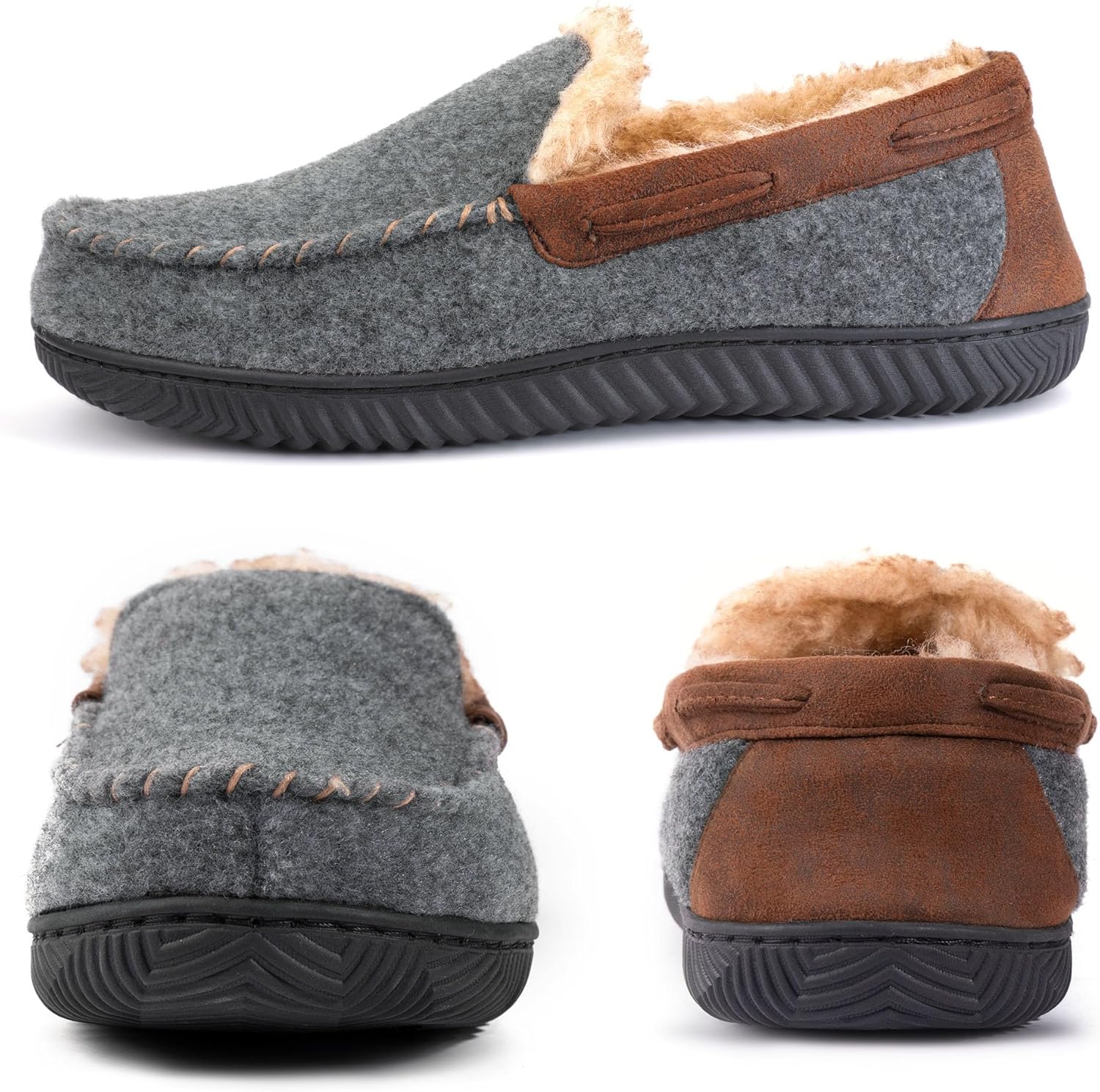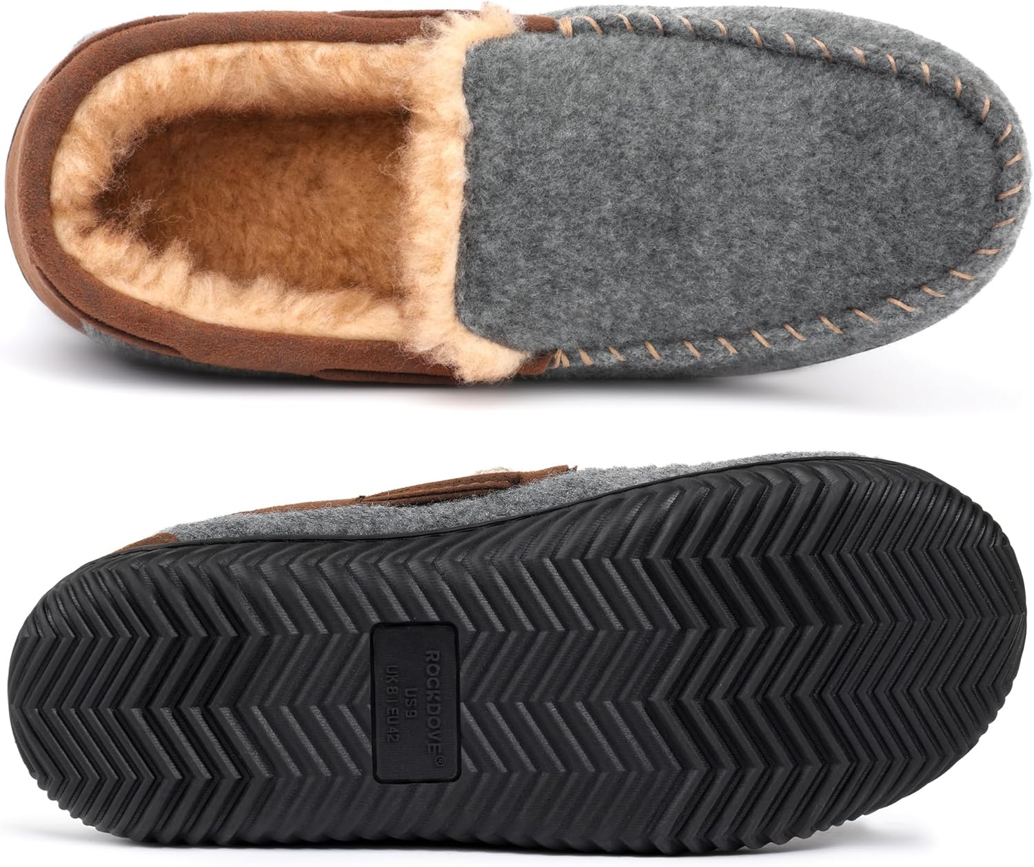 Wool Felt Rubber sole Stay warm and cozy comfortable in this moccasin style slipper, an instant remedy for constantly cold and aching feet. Thickly lined with tipped faux shearling (vegan); we recommend wearing while barefoot to fully experience the warm, fuzzy, and moisture-wicking interior. Memory foam midsole with minor arch support molds to the contours of your feet to reduce uneven stress on your arch and heel. Rubber outsole with anti-skid traction lets you step from indoor to outdoor for quick errands (e.g. pick up the mail or take out the dog). Seams are side stitched (not glued on) for longer-lasting durability. Machine washable for easy care. Sizing tip: this slipper takes a few hours to break in due to the thick lining; if sizing issues persist, please contact our customer service.