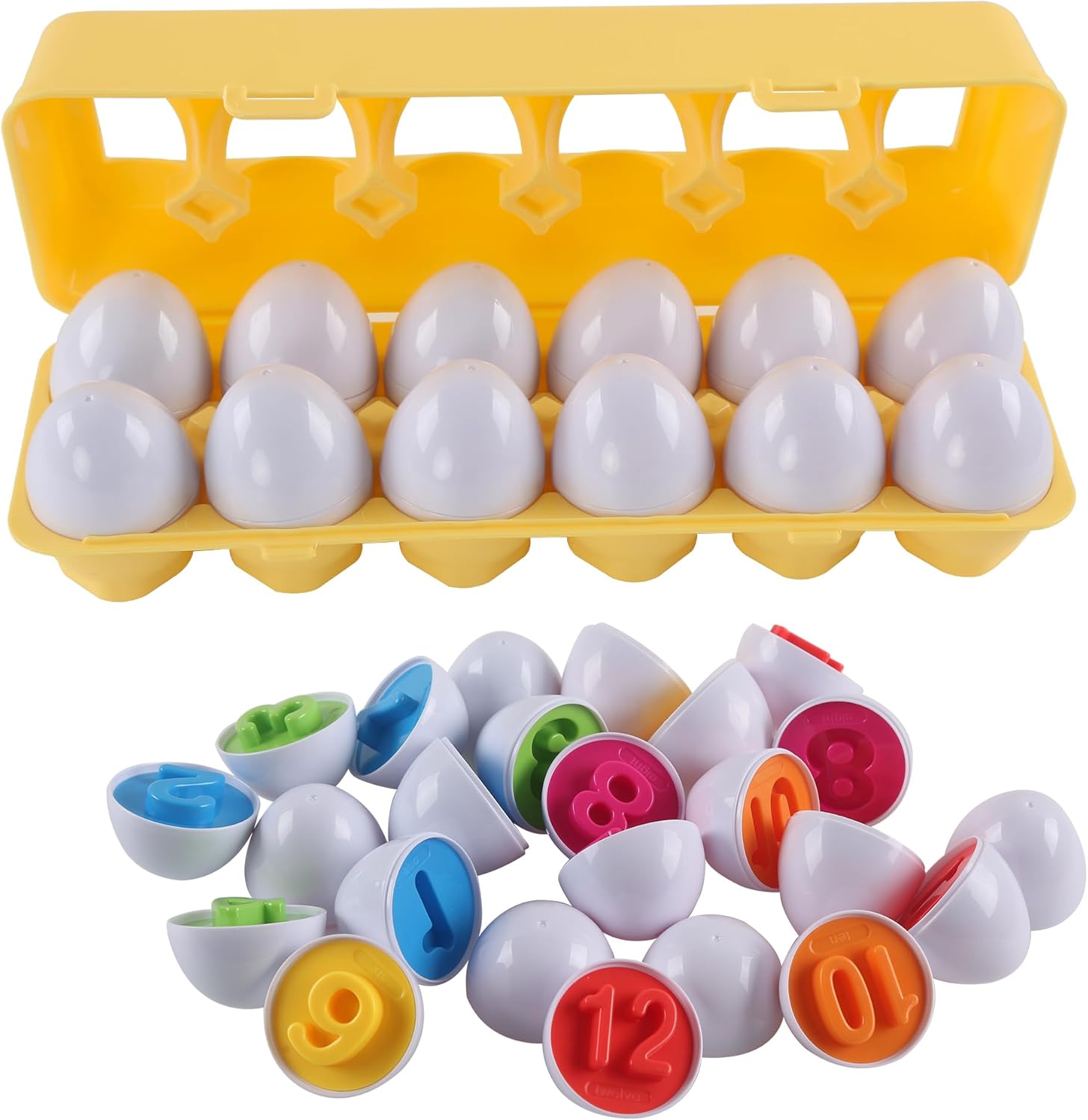 “🌈Early Education Number Egg Toys—Early education number egg toys are perfect for babies to learn numbers.Each egg has a number (1-12) and comes in 6 colors (blue, purple, pink, red, yellow, green). Open the eggs, identify them based on numbers, colors, and shapes, then match those with the same numbers and colors.”