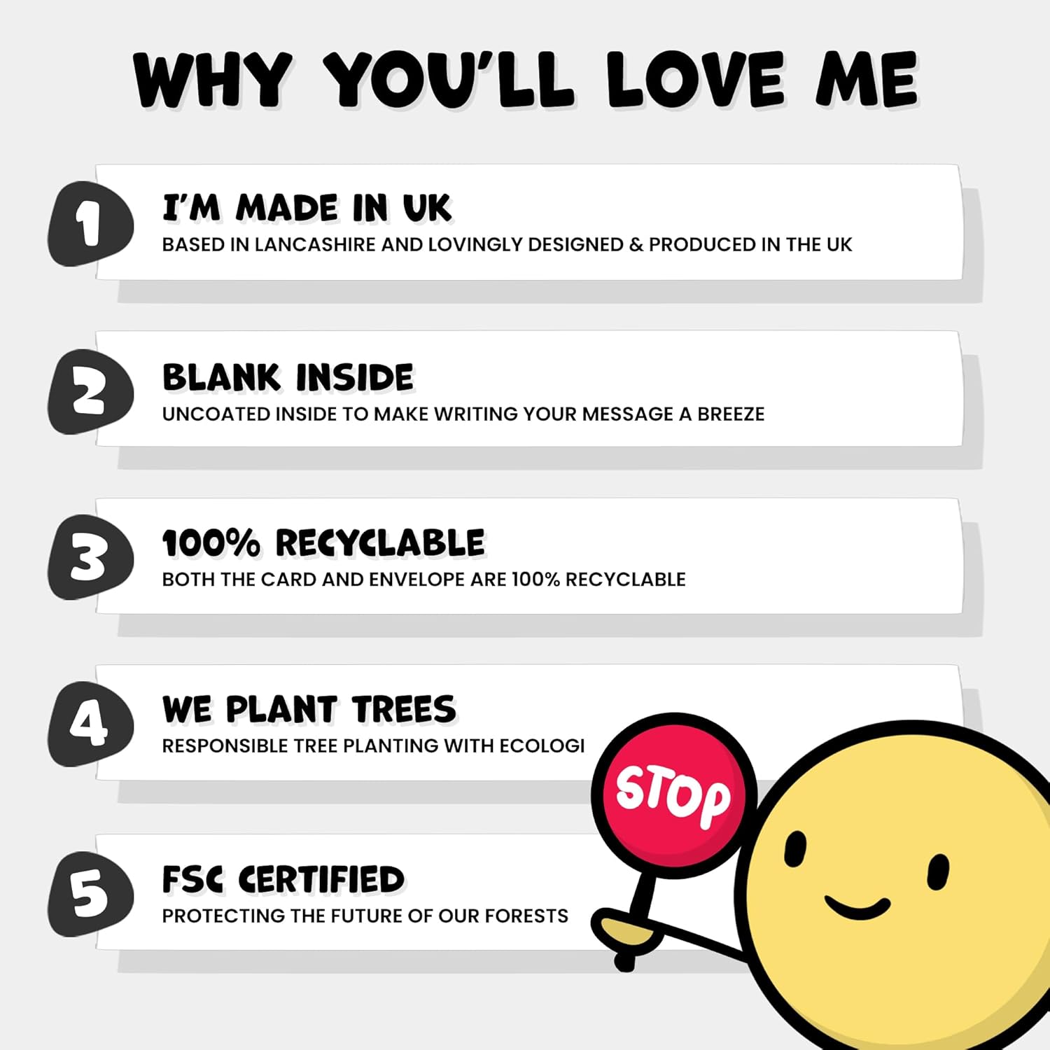 – Card: 300gsm smooth, heavyweight greetings card