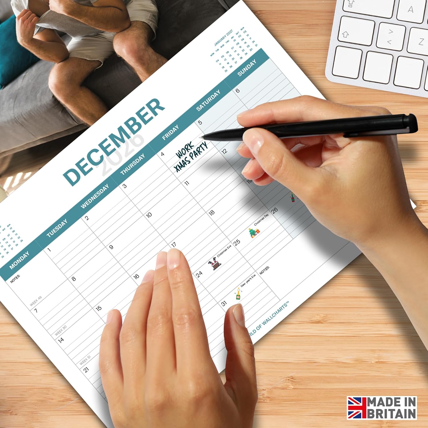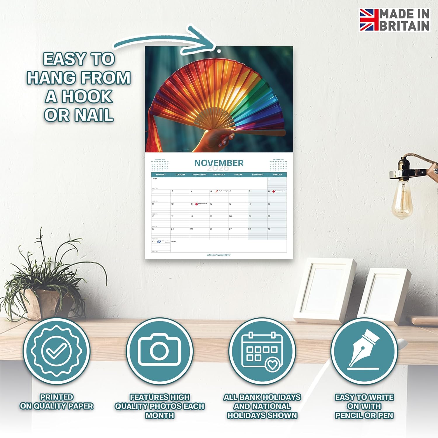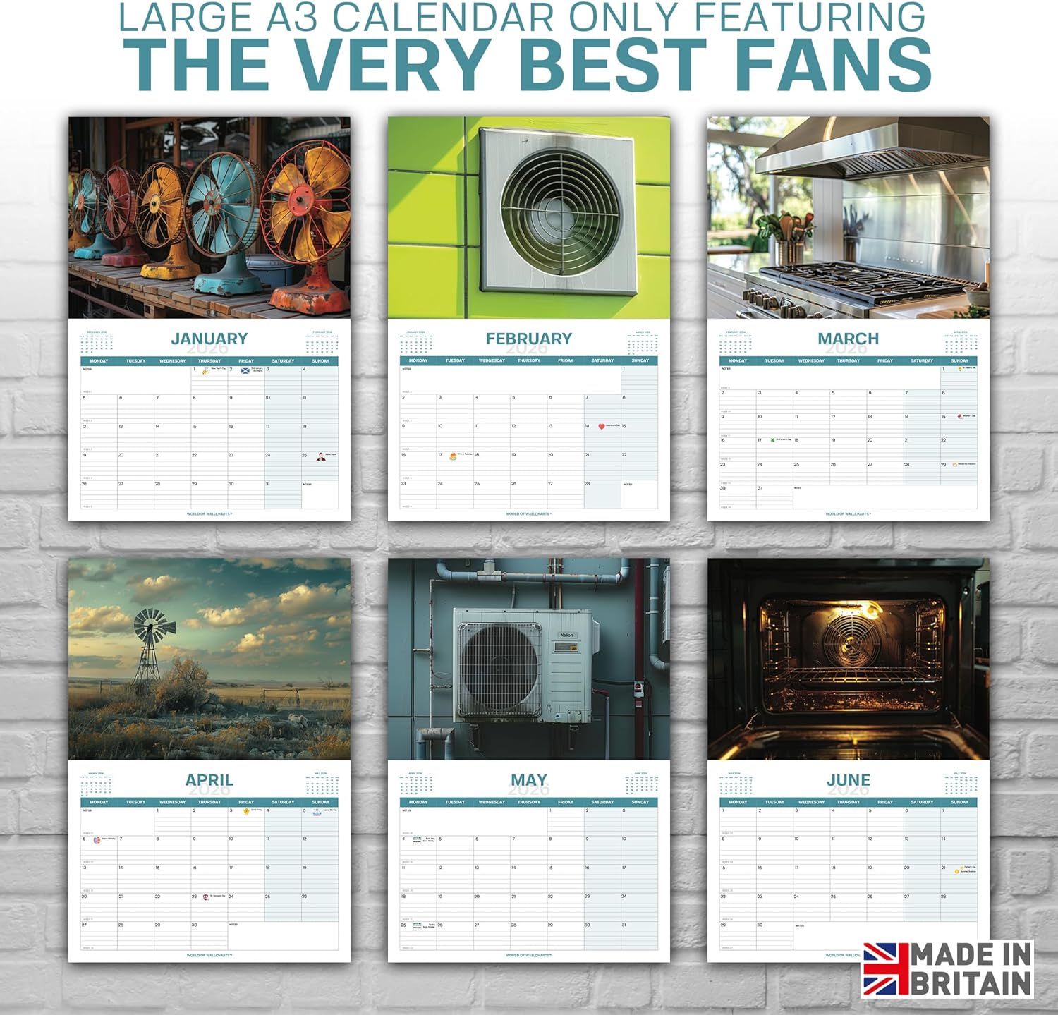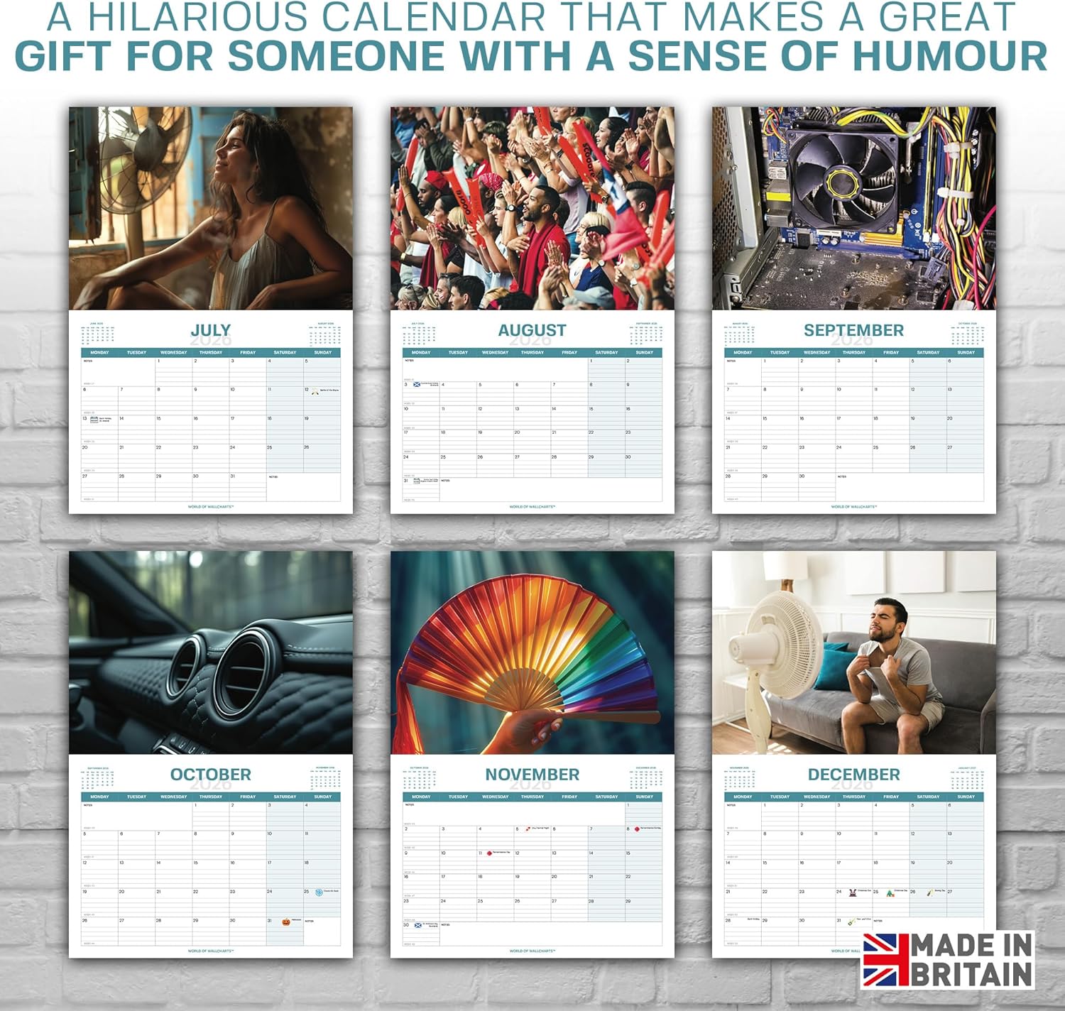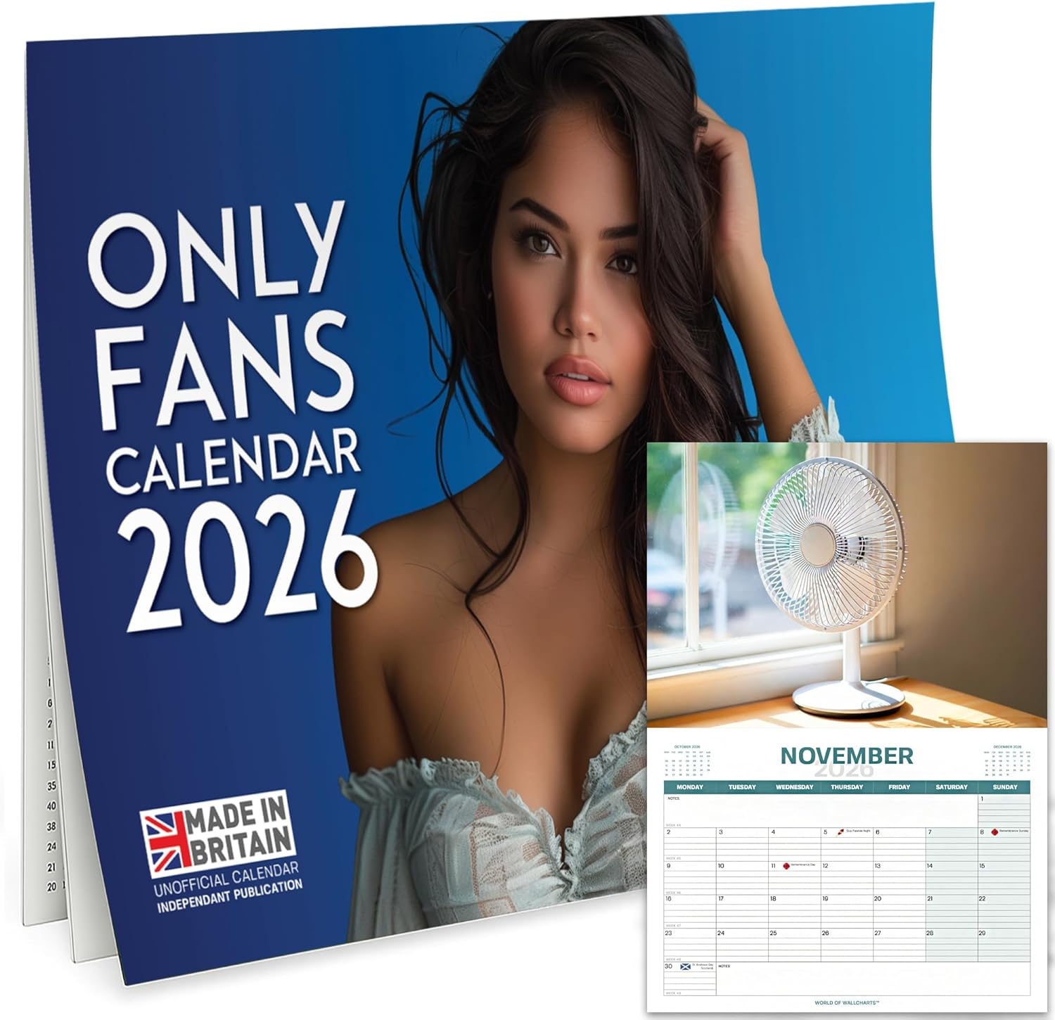 Product Type Novelty Wall Calendar (Humour/Gag Gift) Design Theme: “Only Fans” pun – featuring 12 different photos of real fans (desk, ceiling, football fan) Year Coverage: January 2026 – December 2026 (12 Months) Calendar Layout: Large monthly grid with space for notes, shaded weekends and mini month previews Size & Dimensions: 30 x 42 cm (A4 size, opens to A3) – Easy to hang Weight: 180g (slim, easy for posting as a gift) Paper & Print Quality: High-Quality, full colour photography – no bleed through Holiday Markings: Includes UK bank holidays, Christmas, St Patrick’s & More Mounting Options: Wall Hang on a pin or hook Audience / Gifting: Secret Santa for Men, Funny Gift for Him, Christmas, Stocking Filler, Office Gag Gift