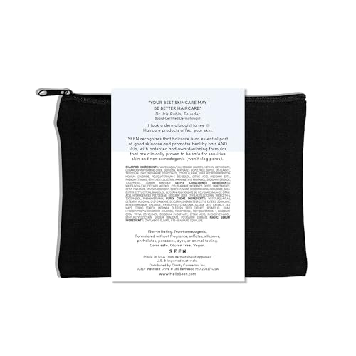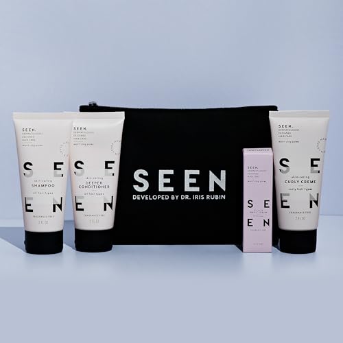A dermatologist-developed, fragrance-free, vegan, non-comedogenic set for curly hair that features travel-friendly sizes of SEEN Shampoo, Deeper Conditioner, Curly Creme and Magic Serum.