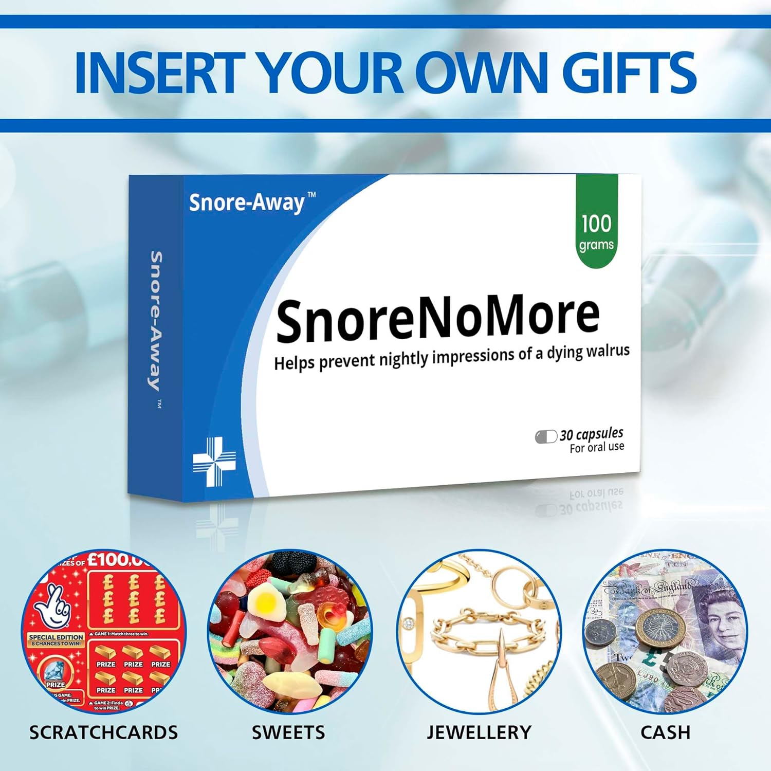 Give the gift of laughter with SnoreNoMore, the hilarious fake medication box that you can fill with what ever you wish to give the recipient (we recommend jelly beans!). Perfect as a quirky stocking filler, birthday surprise, or novelty gift, this gag present is sure to crack up dads, husbands, and mates alike. Designed to look like real medicine, it’s a brilliant prank and a fun way to show you care with humour. Ideal for anyone who snores, or just loves a good laugh, this makes a top choice for funny dad gifts and funny gifts for him.