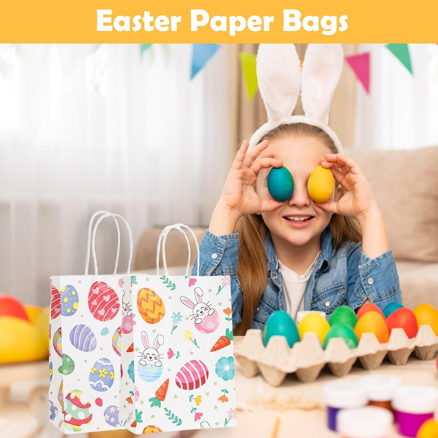 Materials and dimensions:Each easter gifts bag measures approximately 21 x 15 x 8 cm (8.3 x 5.9 x 3.15 in) and is made of durable kraft paper with reinforced handles for long-lasting durability. The rich color design adds vitality to easter.