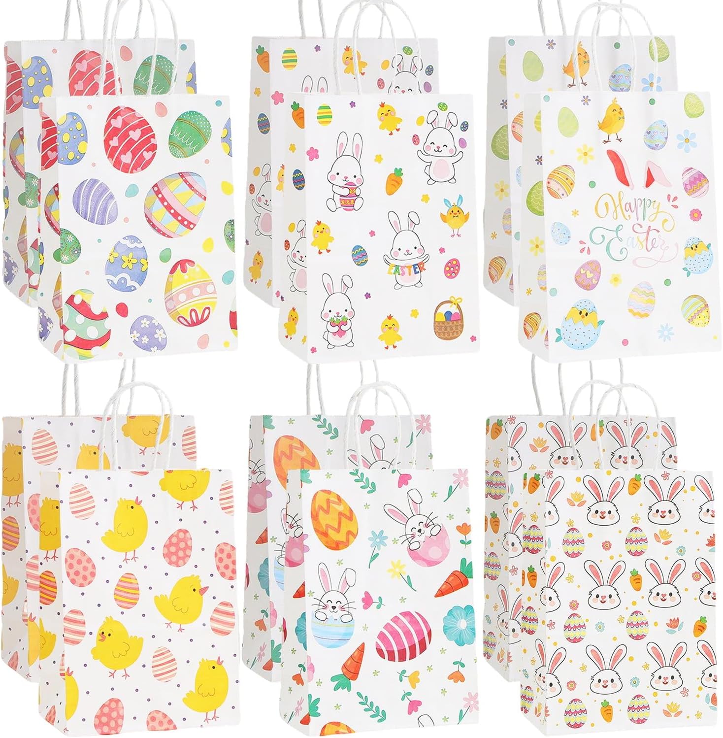 Unique designed gift bag:12pcs easter gift bags in 6 different styles, including rabbits, eggs, chicks and other easter themes, to meet the preferences of different groups of people.