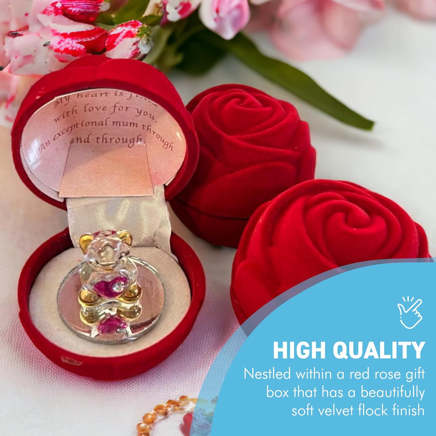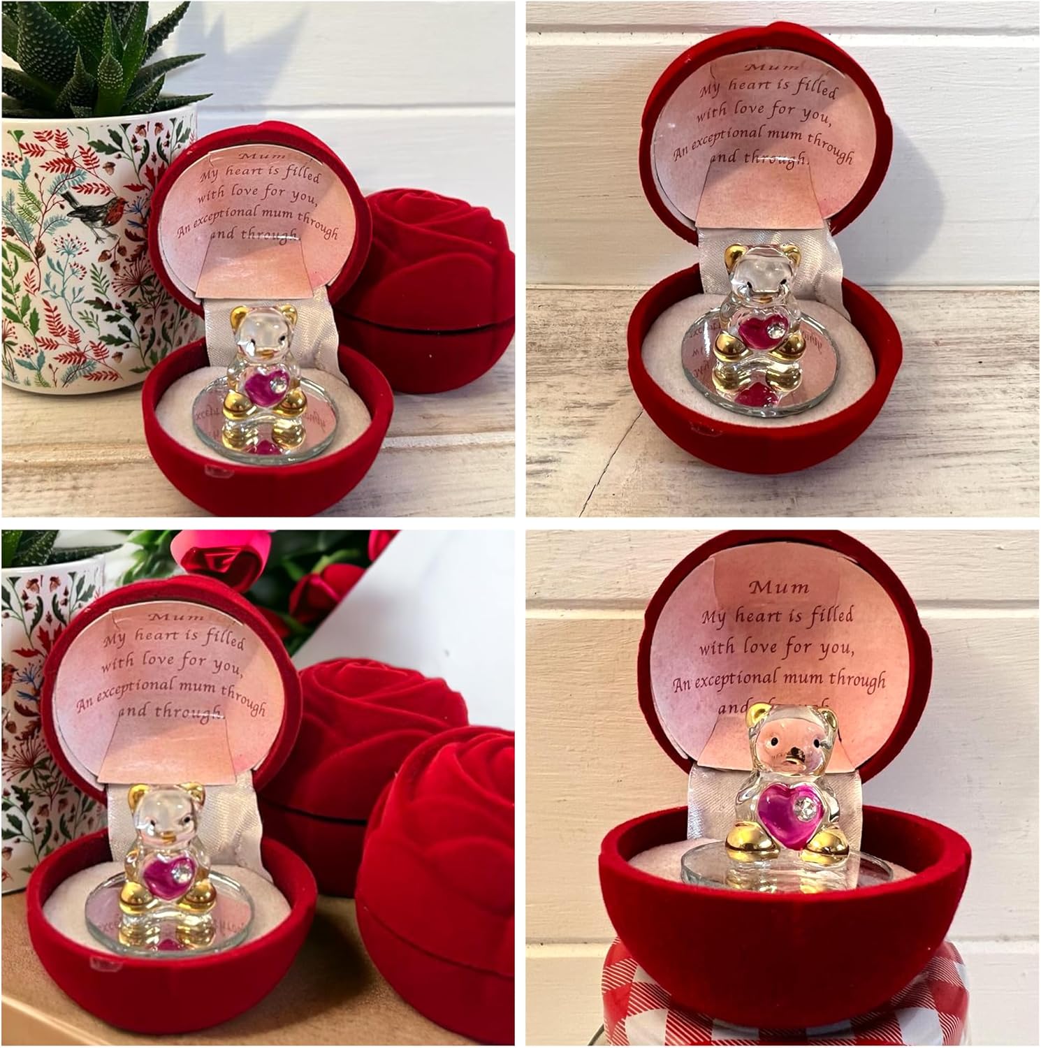 Snuggled in a beautiful ruby red rose shaped gift box a tiny GLASS ANGEL BEAR peeks shyly from beneath the lid. This would make an ideal gift for your mother on her Birthday, at Christmas or on Mother’s Day from a Son or Daughter or at any time just to tell Mum she is loved.