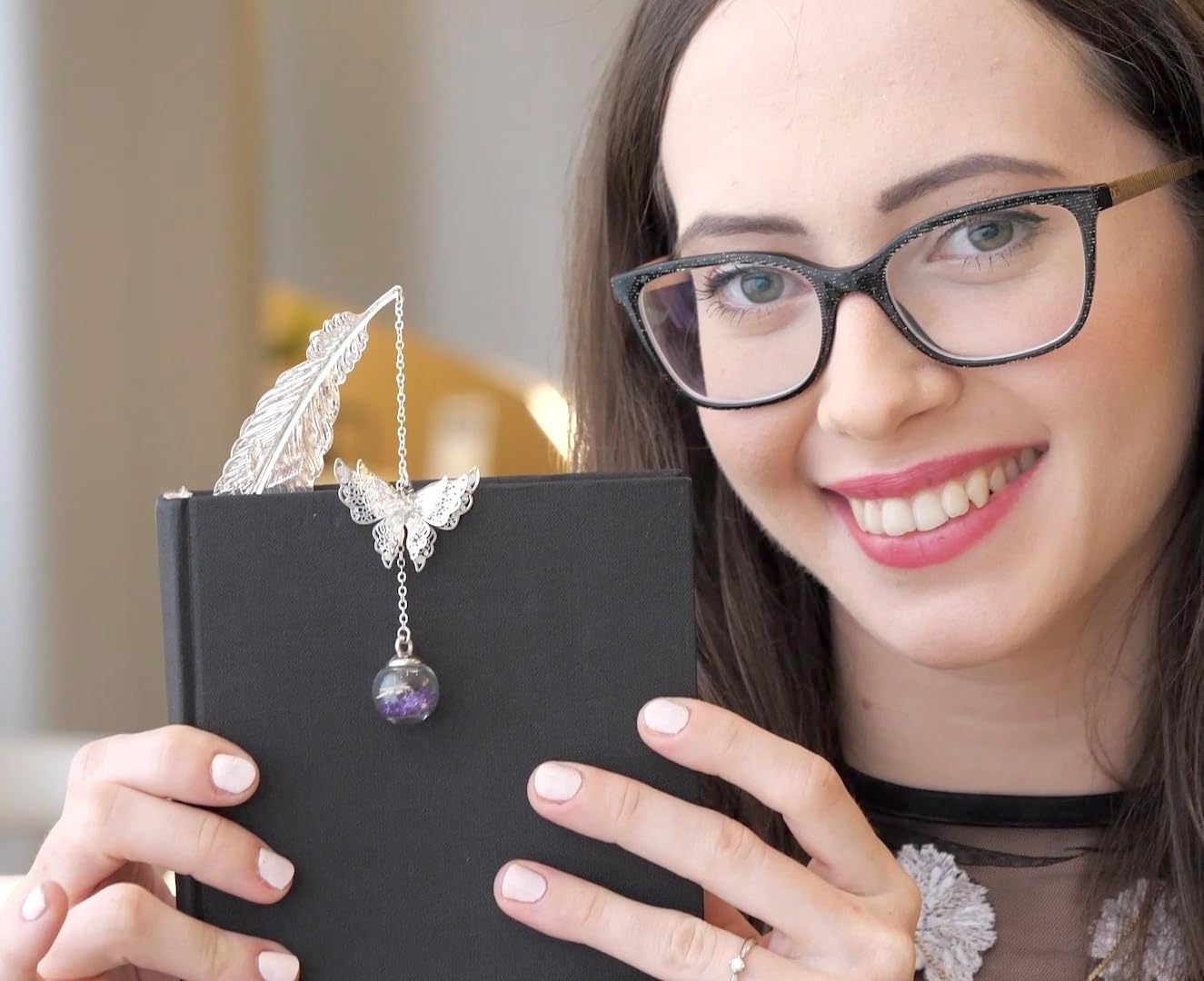 The video showcases the product in use.The video guides you through product setup.The video compares multiple products.The video shows the product being unpacked. feather bookmark for women christmas gift Merchant video