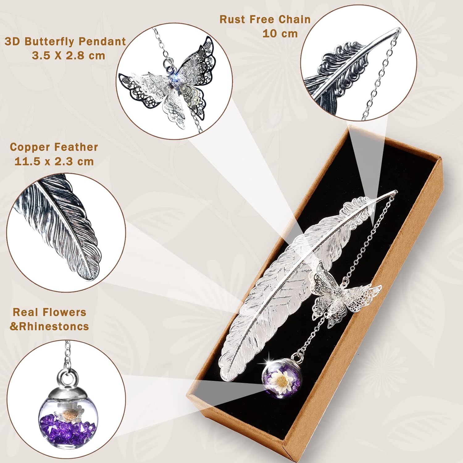 Crafted with Care: Quality, Design & Feminine Elegance Delicate silver feather-shaped bookmark and butterfly pendant necklace with pink crystal charm, displayed in gift packaging.Delicate silver feather-shaped bookmark and butterfly pendant necklace with pink crystal charm, displayed in gift packaging. Exquisite Handcrafted Detail