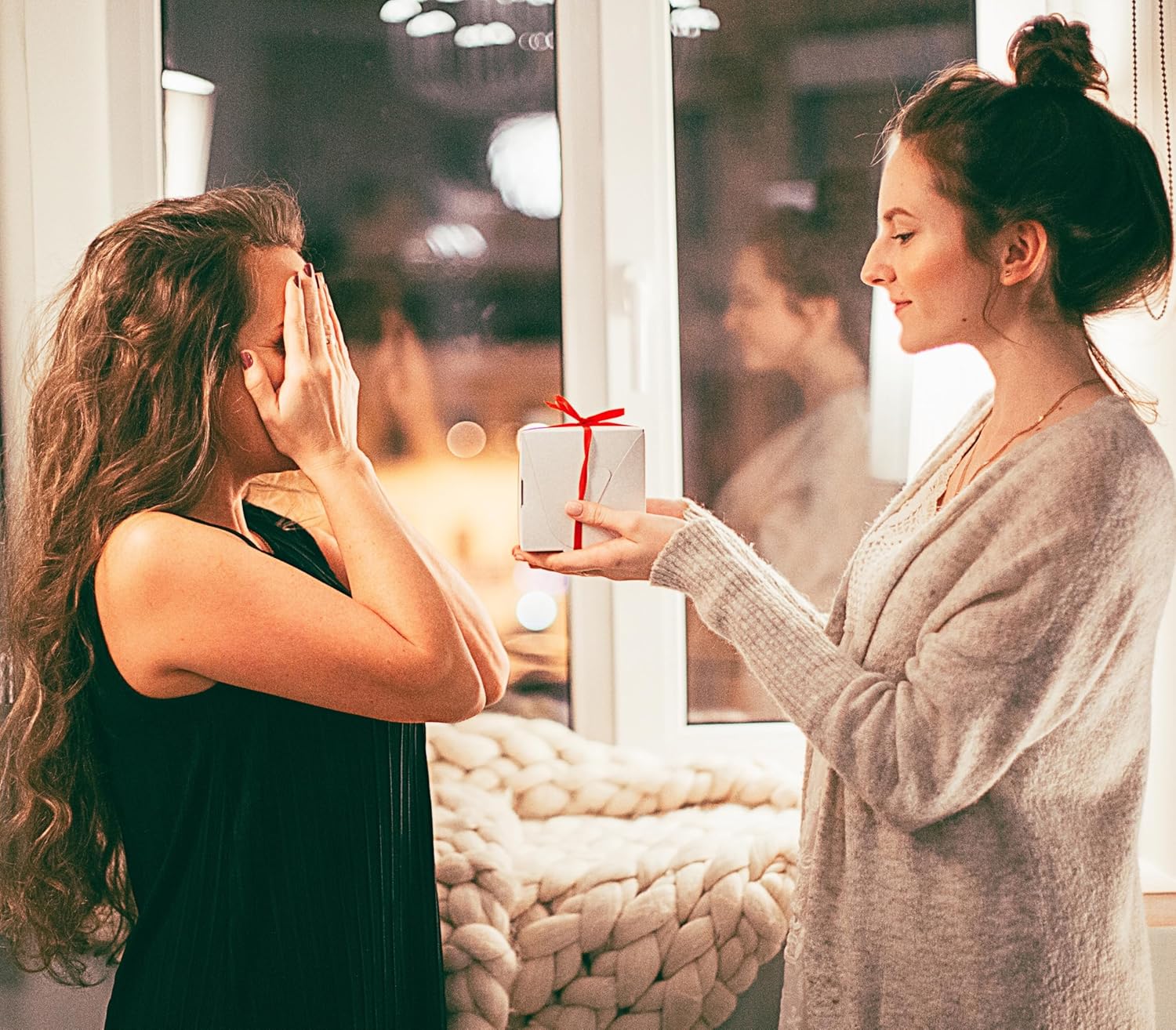 Two people exchanging a gift or present in warmly lit interior setting with windows in background. One wearing black, other in beige cardigan.Two people exchanging a gift or present in warmly lit interior setting with windows in background. One wearing black, other in beige cardigan.