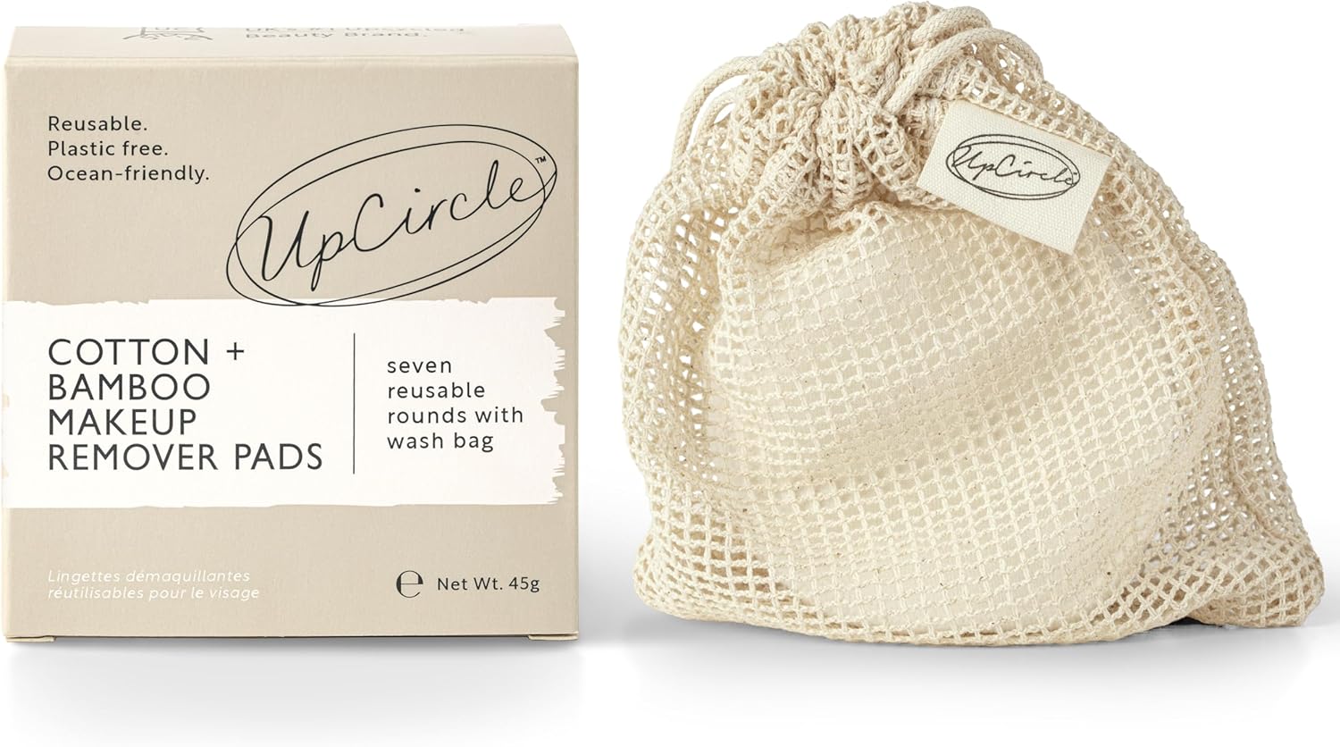A pack of 7 reusable cotton pads.Say good-bye to disposable, single-use wipes, cotton pads and cotton wool thanks to UpCircle Beauty’s reusable Bamboo and Cotton Makeup Pads. With seven luxury pads included, one for each day of the week, these luxury triple layer pads feel silky soft on your skin whilst gently removing eye makeup, mascara and foundation. You can wash within the mesh wash bag included to keep them together.