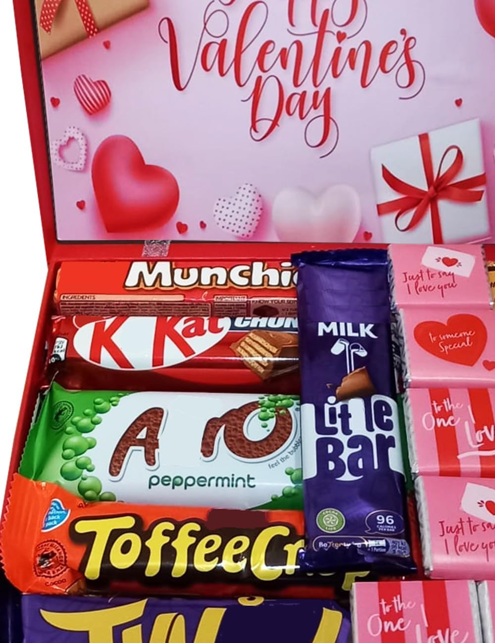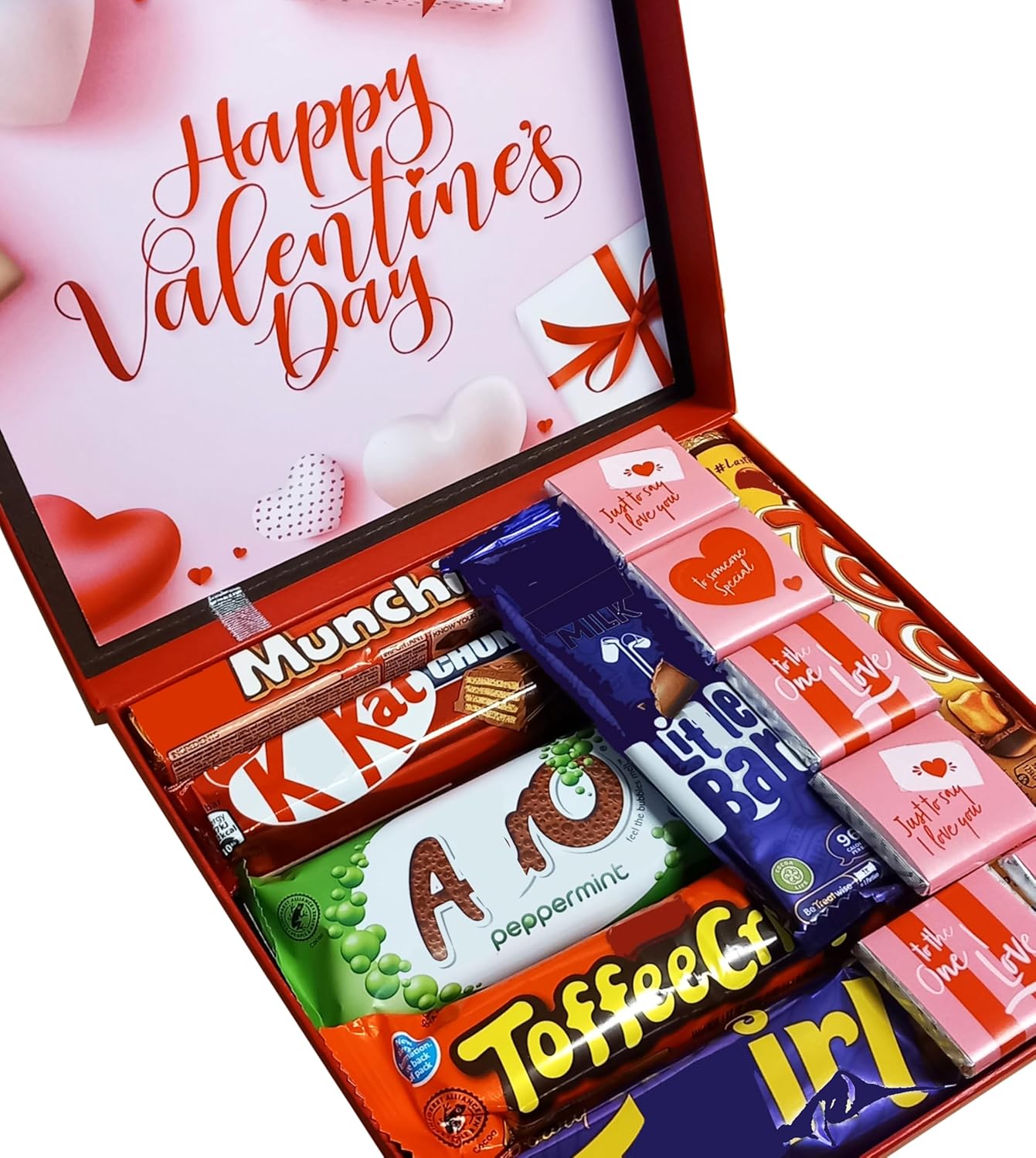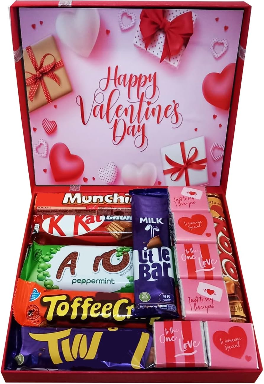 Make Valentine’s Day unforgettable with this Valentine’s Day Chocolate Gift Box Hamper, packed with a delightful assortment of popular chocolates and charming love-themed neapolitan squares. Beautifully arranged inside a romantic Valentine’s presentation box, this hamper is ready to gift straight away, making it a hassle-free yet thoughtful present. The combination of well-known chocolate bars and individually wrapped mini chocolates offers variety, indulgence, and a heartfelt touch.